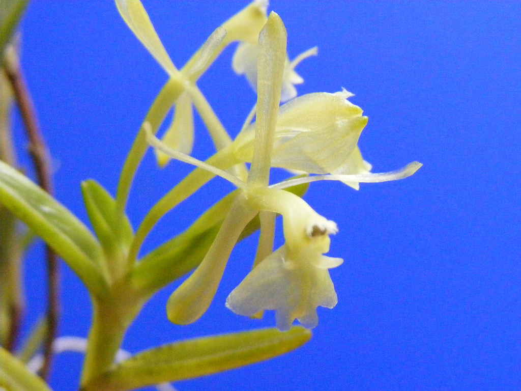 Found in Nicaragua, Costa Rica and Panama in montane wet forests, oak and cloud forests at elevations around 650 to 2000 meters as a small to medium sized, warm to cool growing epiphyte with simple, cane-like, slightly laterally compressed, straight to slightly flexuous stems carrying 7 to 13, distributed all along the stem, coriaceous, smooth, light green, linear, obtuse, conduplicate below into the clasping base leaves that blooms in the spring and summer on an apical, arising on a mature stem, flowering only once, subcorymbose, subsessile, very short inflorescence with ovate acute floral bracts that are much shorter than the ovary and carrying 2 to 4, simultaneously opening, nocturnally scented, resupinate flowers.