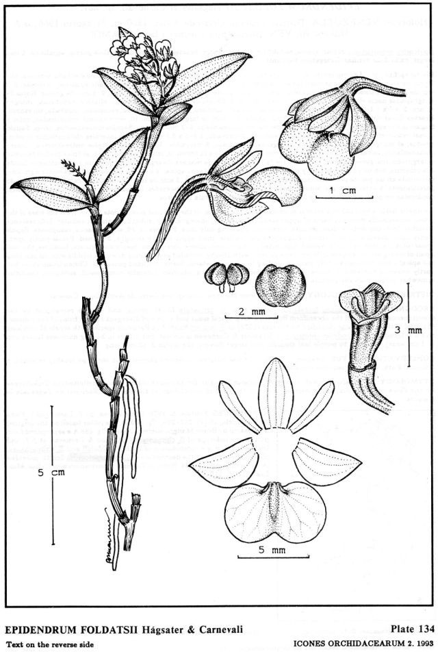 "Epidendrum foldatsii belongs to the' GROUP Arbuscula characterized by the successive lateral growths arising from the middle of the previous stem and carrying a few leaves aggregate towards the apex that blooms on an arching, terminal inflorescence with membraneous, colorful flowers with a bicallose lip. The species can be recognized by the simultaneous flowers and the obreniform lip with a deep apical sinus and a pair of divergent calli in front of the column. Material of this species was identified by Foldats (1970) as E .lechleri Rchb. f., a Peruvian species with sepals .52" [13 mm] long and a 3-lobed lip. Epidendrum chimantense Hágsater & Carnevali is similar, but differs in having narrower leaves, up to .4" [1 cm] wide. lavender to purple leaf sheaths, and larger flowers, the sepals .36 to .4" [9 to 10 mm] long." Hagsater etal 1993