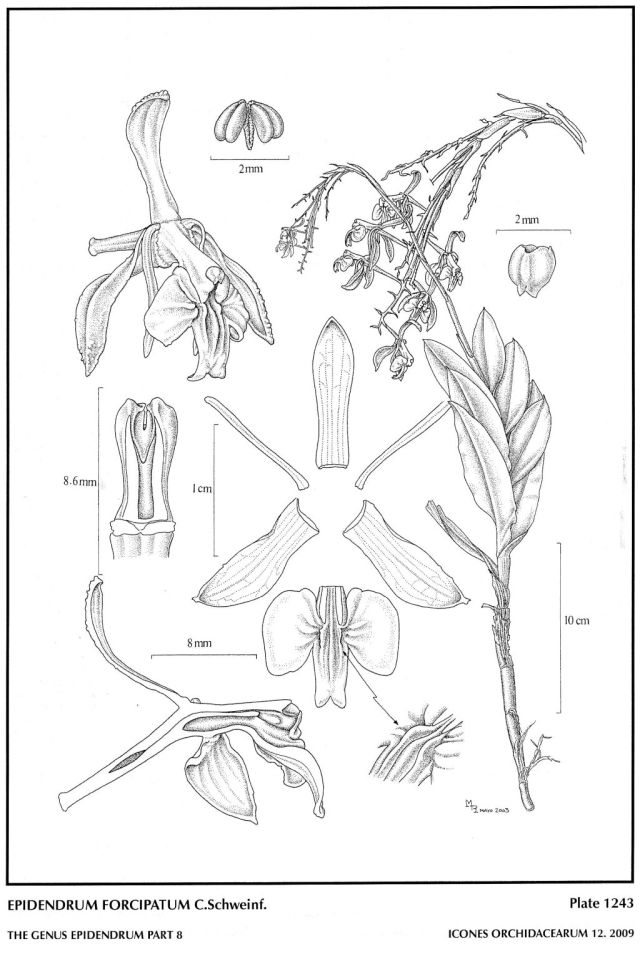 " Epidendrum forcipatum belongs to the GROUP Anceps SUBGROUP Polyanthum , recognized by the caespitose habit, simple stems, pluri-racemose inflorescence flowering over several years, elongate racemes and fleshy flowers and linear petals. The species is recognized by the generally crisped-undulate leaves, about 10 [30] flowers of green-ochre tones, filiform petals. Epidendrum forcipatoides Hágsater, from Bahía, Brazil has relatively small plants, with smaller flowers, the obovate sepals about .24 to .26" [6.0 to 6.5 mm] long, and the margin of the leaves is not undulate." Hagsater etal 2009