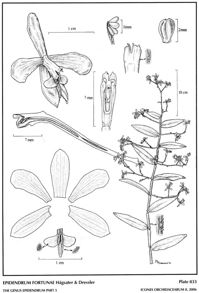 "Epidendrum fortunae belongs to the GROUP Oerstedella which is characterized by the sympodial habit, mostly verrucose stems, and the rostellum whlch is transverse to the column instead of parallel, forming a wide open sinus, and SUBGROUP Intermixtum which has small, membranaceous flowers with a bifid, petaloid clinandrium-hood, and laterally compressed, obovoid pollinia with long, granulose caudicles. The new species is closely similar to E. fuscinum, and is distinguished from it by the taller plants, smaller flowers with sepals .36 to .44" [9 to 11 mm] and the noticeably smaller lip and the lateral lobes being only slightly longer than wide .08 to .12" [2 to 3 mm] long. Epidendrum fuscinum has .52 to .6" [13 to 15 mm] long sepals, with the lateral lobes of the lip .28 to .4" [7 to 10 mm] long, and about 2 to 3 times longer than wide. It is closely related to Epidendrum folsomii Hágsater which is found at lower altitudes, 600 to 800 meters in elevation around El Copé; that species flowers in July to October. It appears that these three species are highly localized, though clearly recognizable by the size, thickness of the flowers and especially the lip. Nearly all specimens have been previously identified as Epidendrum intermixtum Ames, F.T.Hubl. J. & C.Schweinf. which is restricted to central- western Costa Rica and not found in Panama." Hagsater etal 2006