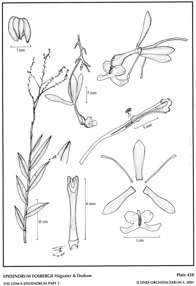 "Epidendrum fosbergii belongs to the GROUP Pseudepidenrum SUBGROUP Paniculatum characterized by the caespitose habit with cane-like stems carrying acute to acuminate leaves usually booming on an apical inflorescence and carrying flowers with filiform petals, and a usually 3 lobed lip with 3 parallel fleshy keels, with the apical lobe often bifurcate and the "bird wing" type pollina. The species is recognized by the successive flowers, long, thin column, reduced clinandrium, green f1owers, lip with a purple blotch on and around the disc, sepals .44" [11 mm] long, the apical lobes of the lip oblong and curved, apex rounded. It is similar to E. paniculatum Ruiz & Pávon (fide Garay, F) in size, but that species has slightly longer sepals .52" [13 mm], simultaneous f1owers and the apical lobes of the lip triangular and curved, more acute." Hagsater etal 2001