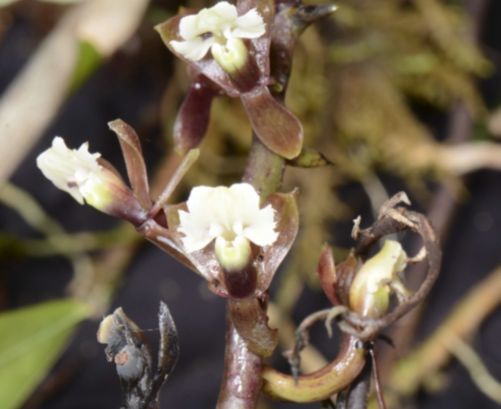 Found in the upper eastern slope of the Cordillera Oriental in Napo province of Ecuador and northern Peru in cloud forest, at elevations of 1850 to 3550 meters as a miniature to medium sized, cool to cold growing epiphyte or lithophyte with simple, cane-like, terete at base, laterally compressed at the apex, erect, straight stems covered at base by non-foliar, scarious becoming fibrous though time sheaths and carrying 3 to 4, distributed towards the apical half of stem, alternate, articulate, sub-spreading, purple in color; sheath tubular, laterally compressed, striated, reddish purple, blade elliptic, acute, margin entire, spreading leaves thta blooms in the fall on a terminal, through a tubular along basal half, conduplicate above, somewhat ancipitose, sub-acute spathe, peduncle .8 to 2.4" [2 to 6 cm] long, terete, thin, erect, purple-brown, concolor, nearly totally hidden by the spathe, 4.4 to 8" [11 to 20 cm] long overall, apical, racemose to pluri-racemose, producing new racemes in successive years from the same peduncle, rachis 3.6 to 5.6" [9 to 14 cm] long, terete, thin straight, same color as the peduncle erect, laxly, successively from base towards the apex (usually at least 5 open at one time), [2] 4 to 11 flowered inflorescence with shorter than the ovary, narrowly triangular, acuminate, embracing, purple-brown floral bracts and carrying non-resupinate, fishy scented flowers
