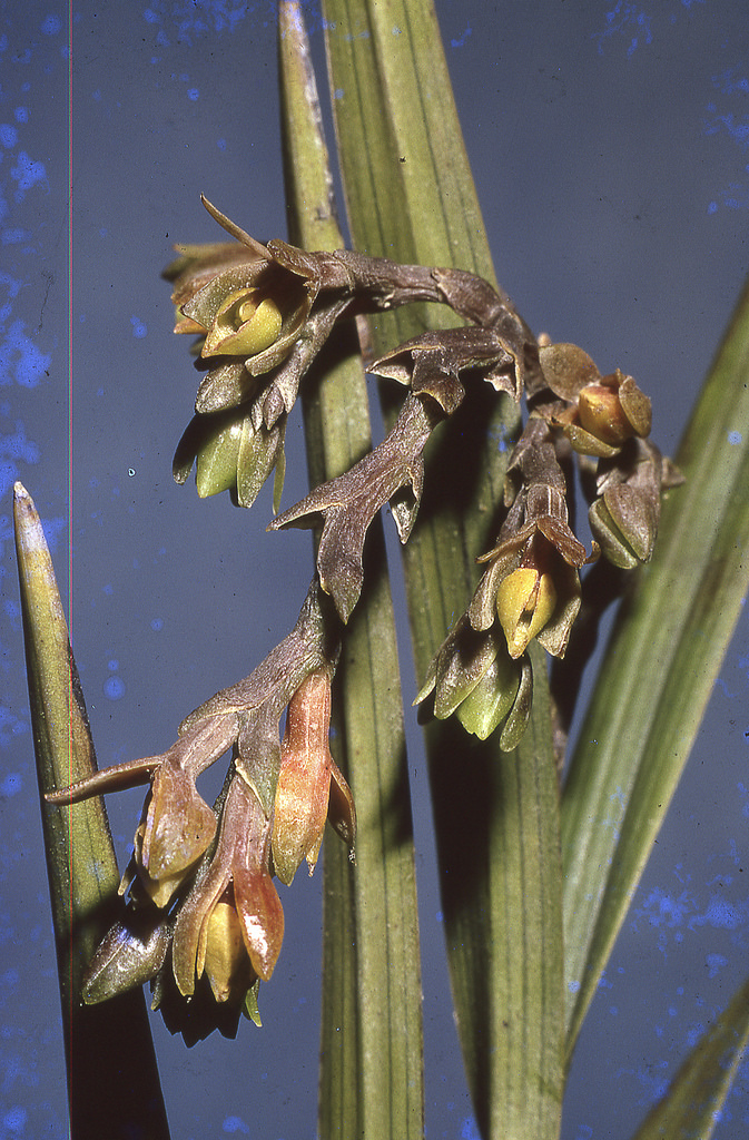 Found in Colombia, Ecuador, Peru and Bolivia in wet, high altitude, cloud forests on embankments at elevations of 2400 to 3600 meters as a medium to large sized, cold growing epiphyte, lithophyte and terrestrial with stiffly erect, terete, cane-like, simple but sometimes few branched, thin, straight stems carrying many all along the stem but sometimes just a few clustered at the apex, narrowly elliptic, stiffly erect, obtuse, rigid leaves that blooms at most any time of the year on a terminal, erect, nude, paniculate, to 6" [15 cm] long, including the short peduncle, the to 6" [15 cm] long, laterals pendent, successively single, many flowered inflorescence.