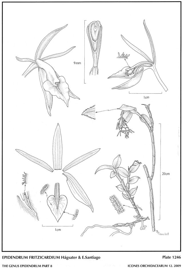 "Epidendrum fritzicardium belongs to the GROUP Andean SUBGROUP Fritzianum characterized by the monopodial stems branched above, the ovate to ovate-elliptic, acute to short-acuminate leaves, lateral sepals obliquely united to the base of the column, and clearly 3-lobed lip. The species is recognized by the racemose to paniculate, lax flowered inflorescence, the sepals and petals partly spreading, the cordiform, short acuminate lip with a narrowly triangular callus, pubescent in the hollow. Epidendrum fritzianum is vegetatively somewhat similar, but the inflorescence is racemose, densely-flowered, sepals and petals are spreading, and the lip is 3- lobed and bicallose, with a thickened, fleshy, rounded disc. The type of branching, paniculate inflorescence, entire, acuminate lip and pubescence in the hollow of the callus and extending into the nectary are quite peculiar, and would seem to suggest a hybrid origin, though we cannot recognize the possible parents." Hagsater etal 2009