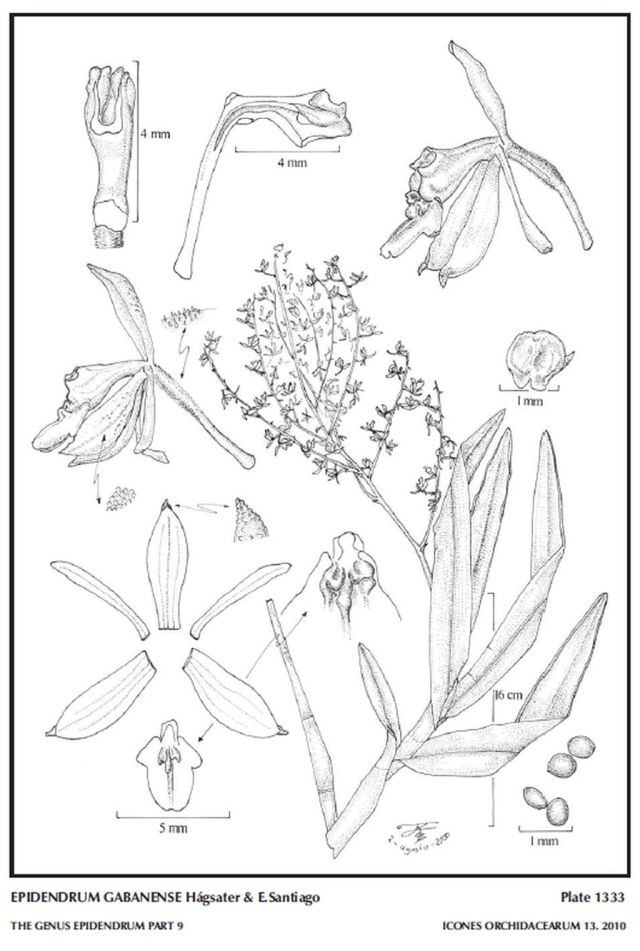 "Epidendrum gabanense belongs to the GROUP Amblostoma SUBGROUP Amblostomioides which is characterized by the sympodial, caespitose habit, the thinly fusiform stems with narrow, apically bilobed, sub-coriaceous leaves distributed along the apical half of the stems, an often large, apical, erect, paniculate inflorescence, the flowers greenish-yellow to white, the ovary and the sepals usually dorsally pubescent, and the lip 3-lobed. The species is recognized by the short-pubescent ovaries, small, delicate flowers, sepals .224 to .288" [5.6 to 7.2 mm] long, dorsally papillate, the shallow, rounded, lateral lobes; the anther with a pair of short, rounded appendages at the apex. It is similar to E. pubiflorum which has larger, heavier flowers with sepals .36 to .44" [9 to 11 mm] long, the lip deeply 3-lobed, with the lateral lobes obliquely dolabriform-ovate, acute, the calli and mid-keel forming three parallel keels; the anther with a pair of apical, acuminate appendages. Epidendrum ancirotylosum Hágsater & E.Santiago also has larger, heavier flowers, but the calli are cuniculate and have an anchor-shaped thickening in front. The plant is very similar to Epidendrum tridactylum Lindl. 1838 , which is vegetatively very similar, but has a deeply 3-lobed lip with similar, narrow, oblong lobes." Hagsater etal 2010