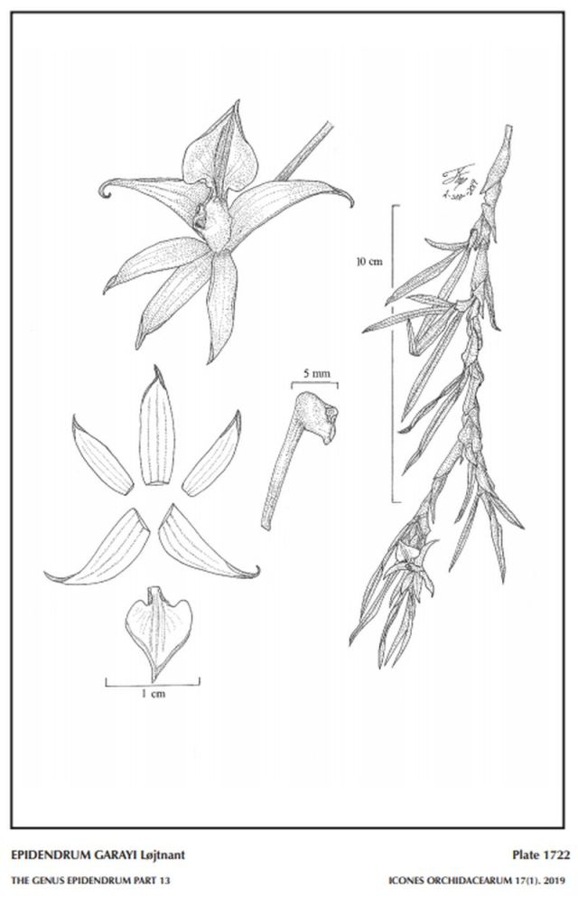 Dr Garay originally described this orchid Pleuranthium cardiochilum in 1953, Lřjtnant in 1977 moved P cardiophyllum into Epidendrum and renamed it Epidendrum garayii in honor of Dr Garay. Alls well with that but Lřjtnant used a different orchid specimen to do his illustration which was in error and is not E garayii therefore that species was renamed Epidendrum falsigarayi Hágsater & Karremans in 2019 by Hagsater & Karremans.