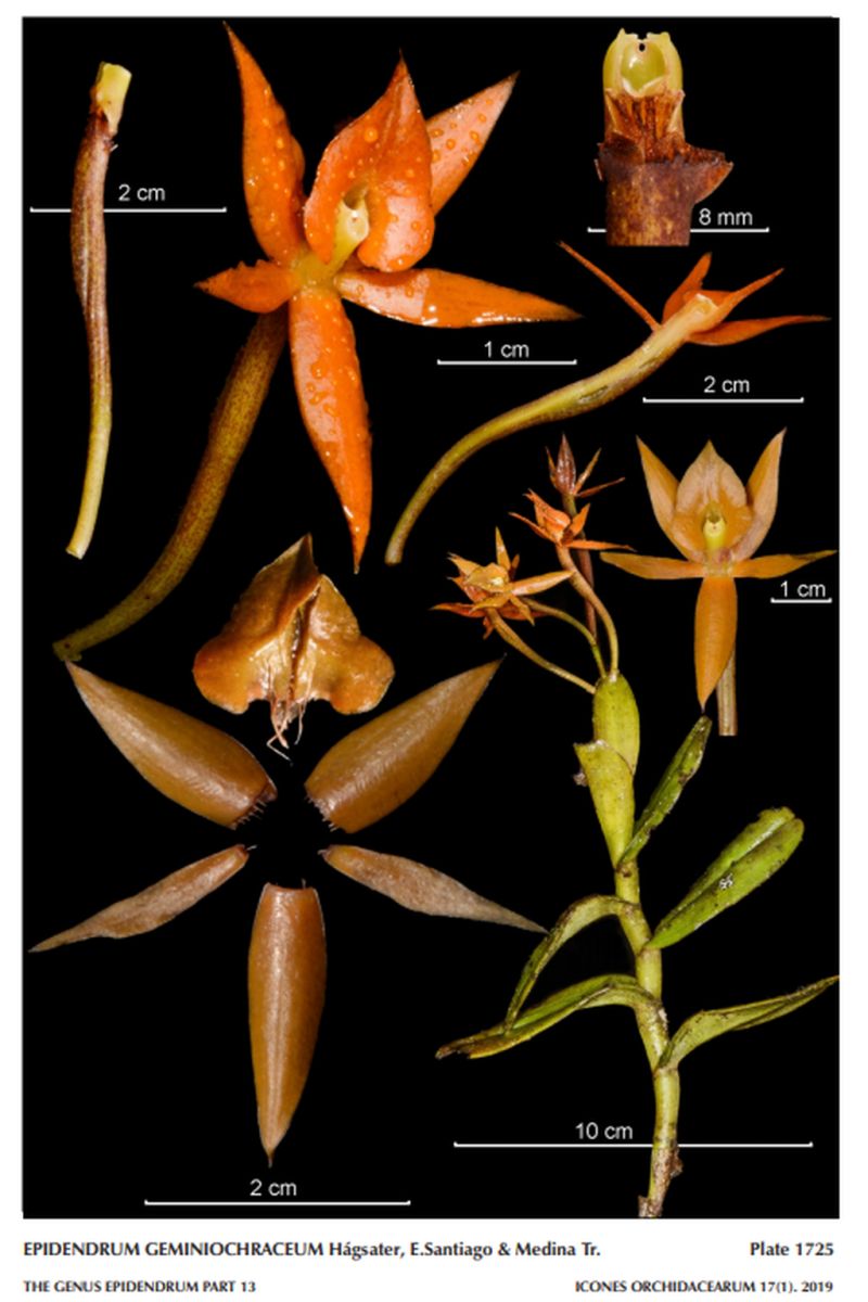 "Epidendrum geminiochraceum belongs to the GROUP Geminiflorum characterized by having a sympodial, scandent, straggling habit, an unbranched stem, 1 to 2 spathaceous bracts, a few-flowered inflorescence, non-resupinate flowers, more than 2 cm in diameter, and the disc of the lip is not excavated with a pair of laminar calli. The new species is recognized by the relatively tall stems to 13.2" [33 cm], leaves 1.2 to 5.2" x .48 to .132" [3.0 to 13.0 x 1.2 to 3.3 cm], oblong, coriaceous and rigid, 2 to 6 flowers fleshy, orange to ochre-orange, sepals .84 to .92" x .26 to .32" [21 to 23 x 6.5 to 8.0 mm], acuminate, longitudinally somewhat convex, petals .732 to .76" x .16 to .24" [18.3 to 19 x 4.0 to 6.0 mm], lanceolate, lip .6 to .68 x .64 to .69" [15 to 17 x 16 to 16.5 mm], clearly 3-lobed, the mid-lobe widely triangular, short-acuminate. Epidendrum geminiflorum Kunth is vegetatively similar, leaves 1.2 to 3.6 x .56 to 1.04" [3.0 to 9.0 x 1.4 to 2.6 cm], oblong, 2 to 3 flowers, green to greenish yellow, sepals acute, margins revolute, sepals .56 to .72" x .14 to .18" [14 to 18 x 3.5 to 4.5 mm], petals .574 to .64" x .108 to .132" [14.4 to 16 x 2.7 to 3.3 mm], lanceolate, lip .4to .52" x .32 to .48" [10 to 13 x 8 to 12 mm], 3-lobed, the lateral lobes semi-orbicular, small. Epidendrum azuayense Hágsater & E.Santiago has stems 2.4 to 6.4" [6.0 to 16 cm] tall, oblong-elliptic leaves .4 to 2" x .32 to .6" [1.0 to 5.0 x 0.8 to 1.5 cm], 2-flowered inflorescence, flowers orange, column green, sepals .52 to .72" x .2 to .24" [13 to 18 x 5.0 to 6.0 mm], oblanceolate petals .48 to .56" x .2 to .24" [12 to 16 x 5.0 to 6.0 mm], and lip .32 to .36 x .44" [8.0 to 9.0 x 11.0 mm], widely cordiform, apex obtuse. Epidendrum megagastrium Lindl. has leaves 1.2 to 2" x .78 to .92" [3.0 to 5.0 x 1.8 to 2.3 cm], elliptic, 3 copper-brown flowers, column pale green, sepals .802 x .304" [20.5 x 7.6 mm], flat, ovate-elliptic, acute, petals .78 x .188" [18.5 x 4.7 mm], oblong-elliptic, lip .456 x .4" [11.4 x 10.0 mm], narrowly cordiform. Epidendrum orbicordichilum Hágsater & E.Santiago has leaves 1.48 to 3.6" x .76 to 1.4" [3.7 to 9.0 x 1.8 to 3.5 cm], elliptic to narrowly elliptic, 2 sepia-ochre flowers turning bright orange with age, sepals acute, minutely apiculate, petals .68 x .216" [17 x 5.4 mm], elliptic, apex sub-acute, lip .56 x .56" [14 x 14 mm], entire, orbicular-cordiform." Hagsater etal 2019