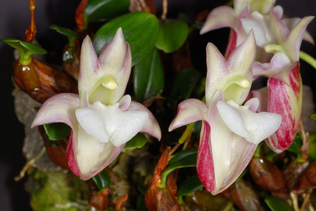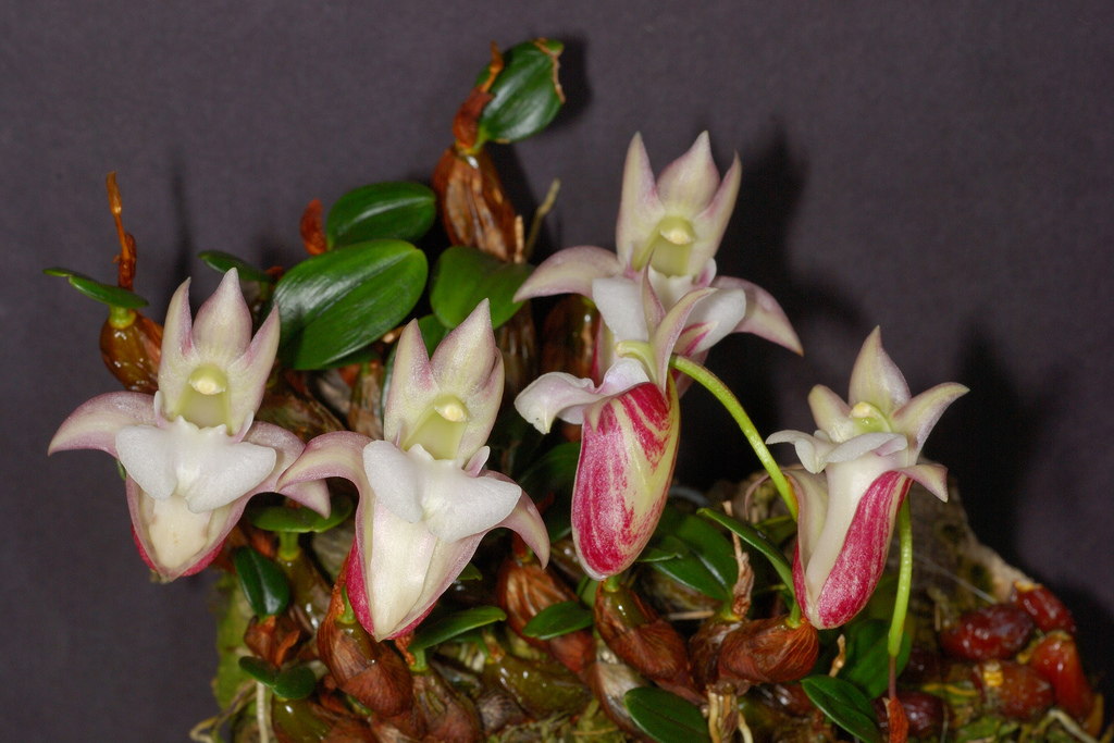 Found in the Chinese Himalayas, Bhutan, Thailand and Taiwan along valleys on rocks or in forests on tree trunks at elevations of 1200 to 1775 as a miniature sized, cool growing epiphyte or lithophyte with .2 to .4" [.5 to 1 cm] between each ribbed, ellipsoid-fusiform, weakly curved pseudobulb carrying a single, apical, erect, plicate, single veined, coriaceous, obovate-oblong, obtuse, narrowing below into the petiolate base leaf that blooms in the spring on a racemose, 1 to 1.2" [2.5 to 3 cm] long, single flowered inflorescence with ovate, acute floral bracts