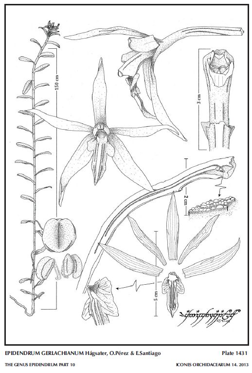 "Epidendrum gerlachianum belongs to the GROUP Andean SUBGROUP Cernuum, which is characterized by the monopodial, branching habit, the erect cane-like stems with a sub-apical branching, racemose, nutant inflorescence, compact, fleshy flowers, with the lip three-lobed. The species is recognized by the tall, erect, stem, erect, compact inflorescence, the large flowers with oblong-lanceolate sepals .164 to .154" [41 to 44 mm] long, linear-oblong petals .16 to .164" [40 to 41 mm] long, and the mid-lobe of the lip oblong, obtuse and apiculate, the apical 1/3 somewhat bent downwards towards the ventral surface of the lip, .6" [15 mm} long. It is similar to Epidendrum steyermarkii A.D.Hawkes, which has lax-flowered inflorescence,2 to 2.8" [5 to 7 cm] long peduncle and rachis; large flowers with oblanceolate to oblong-elliptic sepals 1.1 to 1.4" [26 to 35 mm] long, oblanceolate to sub-spatulate petals 1.04 to 1.12" [26 to 28 mm] long, mid-lobe of the lip oblong and apiculate, .44 to .56" [11 to 14 mm] long. Epidendrum pichinchae Schltr. has taller plants, 80" [2 meters] high, branched above, smaller flowers, the floral segments long-acuminate, lateral sepals falcate, .6 to .84" [15 to 21 mm] long, the mid-lobe of the lip sub-rhombic towards the apical half, with a long, parallel-sided isthmus, and a prominent apiculus." Hagsater etal 2013