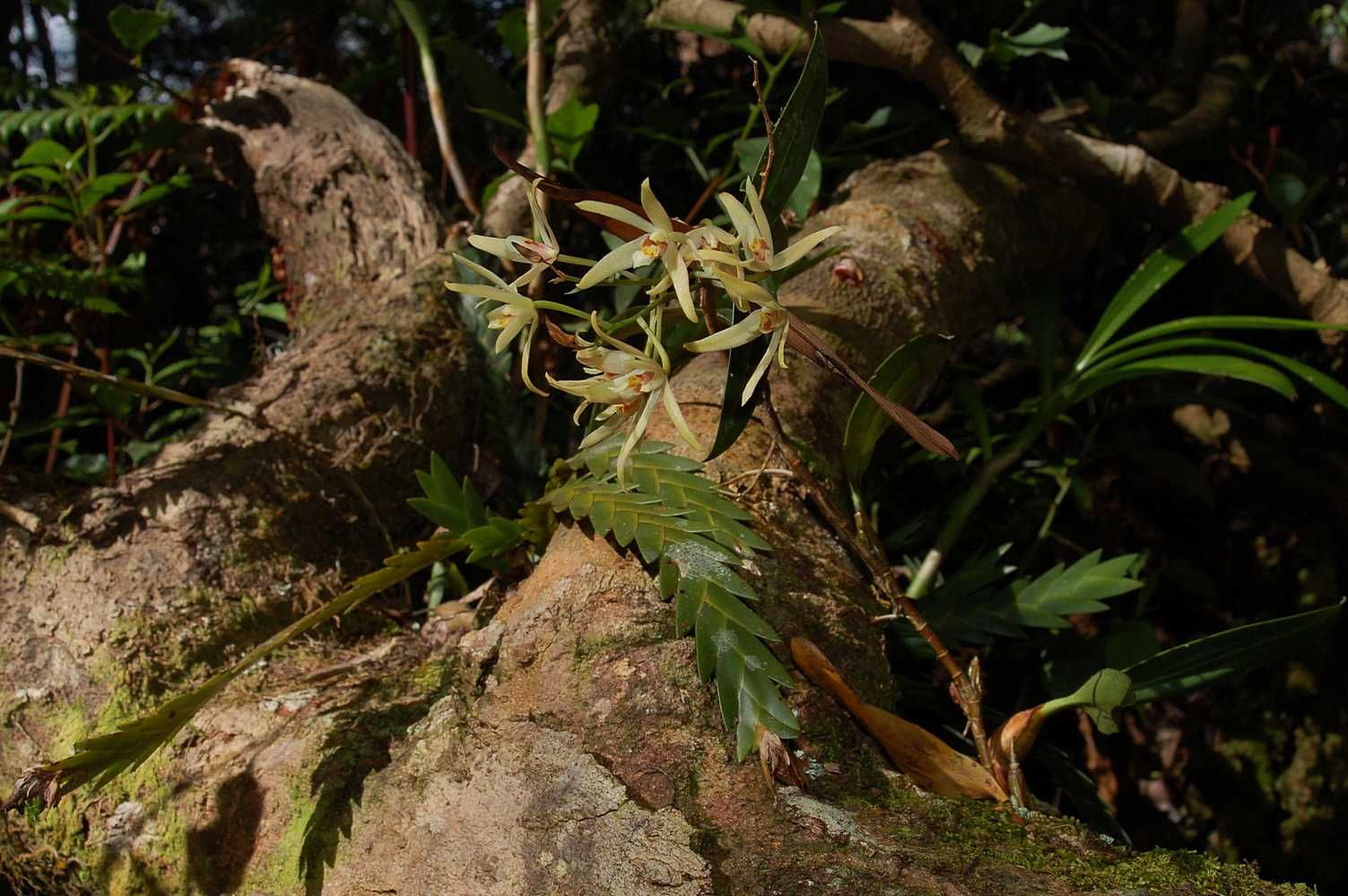 Found in Malaysia, Borneo and Java in lower montane forests, most often close to the ground at elevations of 700 to 1100 meters as a miniature sized, warm growing epiphyte with a long creeping to pendant rhizome carrying, oblong, 4 sided pseudobulbs with long-oval, unequally and obtusely bilobed apically, dark green leaves that develop before the pseduobulbs and blooms in the winter arising before the pseudobulbs properly form, with often 2, 3.2" [8 cm] long, 3 to 6 flowered inflorescence