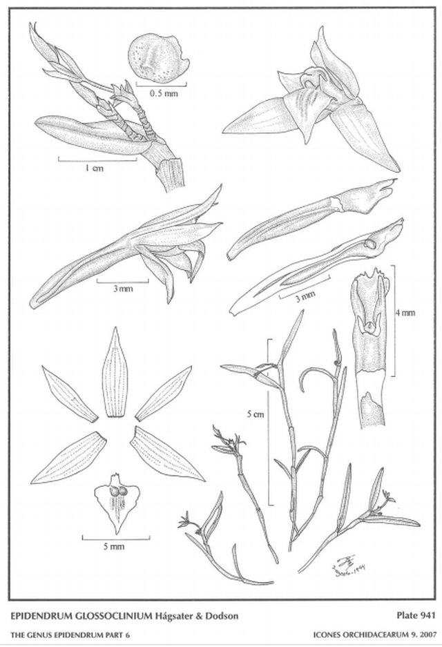 "Epidendrum glossoclinium belongs to the GROUP Alberti SUBGROUP Allenii , recognized by the caespitose habit, ancipitose stems, an apical inflorescence, the imbricating bracts, successive flowers, one at a time, and frequently prominent clinandrium-hood. The species is recognized by the thin, small-leaved .68 to 1.68" x .16 to .2" [1.7 to 4.2 x 0.4 to 0.5 cm] plants, the short, terete peduncle of the inflorescence covered by numerous bracts, successive, pale yellow flowers, one at a time, the partly spreading sepals and petals, triangular, acuminate lip with subglobose calli, and the 3-lobed clinandrium-hood with the lateral lobes oblong, obtuse. The flowers closely resemble E. dactyloclinium from southern Ecuador on the Amazon basin, which has longer, wider, leaves 3.92" to 5" x .4 to .72" [9.8 to 12.5 x 1.0 to 1.8 cm], larger flowers with sepals .504 to .52" [12.6 to 13 mm] lon), the calli of the lip elongate, narrow, and the clinandrium-hood deeply dentate with the lateral lobes narrowly oblong and acute. In its area of distribution it can be confused with E jejunum Rchb.f., a species of the Difforme Group with leaves up to 4.8" [12 cm] long, a cordiform lip and the clinandrium-hood short, slightly surpassing the body of the column. Epidendrum stellidifforme Hágsater & Dodson, also described from Maldonado, has star shaped flowers and the clinandrium hood 3-lobed, with laminar side lobes, and the midlobe deeply dentate." Hagsater etal 2007