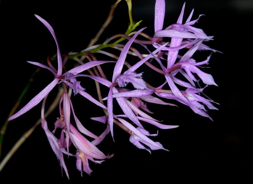 Found in southern Ecuador on the eastern slope of the Andes and in Peru on the Cordillera Condor in very wet premontane forest at elevations of 700 to 1900 meters as a medium to giant sized, warm to cool growing terrestrial or epiphyte among bushes with simple, cane-like, terete, erect, straight, green when young, tinged with purple with age stems carrying distichous, distributed throughout the stem, alternate, articulate, green, unequal in size, narrowly elliptic-lanceolate to lanceolate oblong, apex sub-obtuse, coriaceous, dark green the basal and apical leaves somewhat shorter articulated to the tubular, minutely striated sheaths that blooms in the spring through mid fall on a terminal, peduncle to 16" [40 cm] long, elongate, terete, provided with 5 to 7, tubular, acute, partly imbricating bracts, brown, rachis 2" [5 cm] long, racemose, producing new racemes with time and thus pluri-racemose, each raceme compact, densely, successively to 10, many flowered inflorescence with much shorter than the ovary, linear-triangular, acuminate, embracing floral bracts and carrying non-resupinate, pink-purple including the ovary, the callus white with the apical wings of the column turning yellow when pollen is removed; without fragrance flowers.