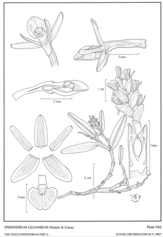 "Epidendrum glumarum belangs to the GROUP Ramosum which is characterized by the submonopodial, much branched stems, apical racemose inflorescence and distichous flowers; and SUBGROUP Ramosum which has an erect primary stem and many smaller branches, several flowers on a zigzag rachis, the floral bracts usually covering more than the ovary. The species has laterally compressed stems, leaves narrowly ovate-elliptic, .24 to .8" [6 to 20 mm] wide, the apex unequally bilobed, 6 to 12 green flowers, the lip cordiform, rounded emarginate, and the callus tridentate. It is similar to E. pseudoramosum Schltr. which has terete stems, narrow, oblong leaves, .4" [10 mm] wide, 2 to 5 flowers with the lip trrangular-ovate. Epidendrum ramosum Jacq. has terete stems, narrow, strap-like leaves, green to yellowish green flowers, acute segments and a triangular lip. Epidendrum mixtum Schltr. is similar to the latter but has larger white flowers, and larger leaves." Hagsater etal 2007
