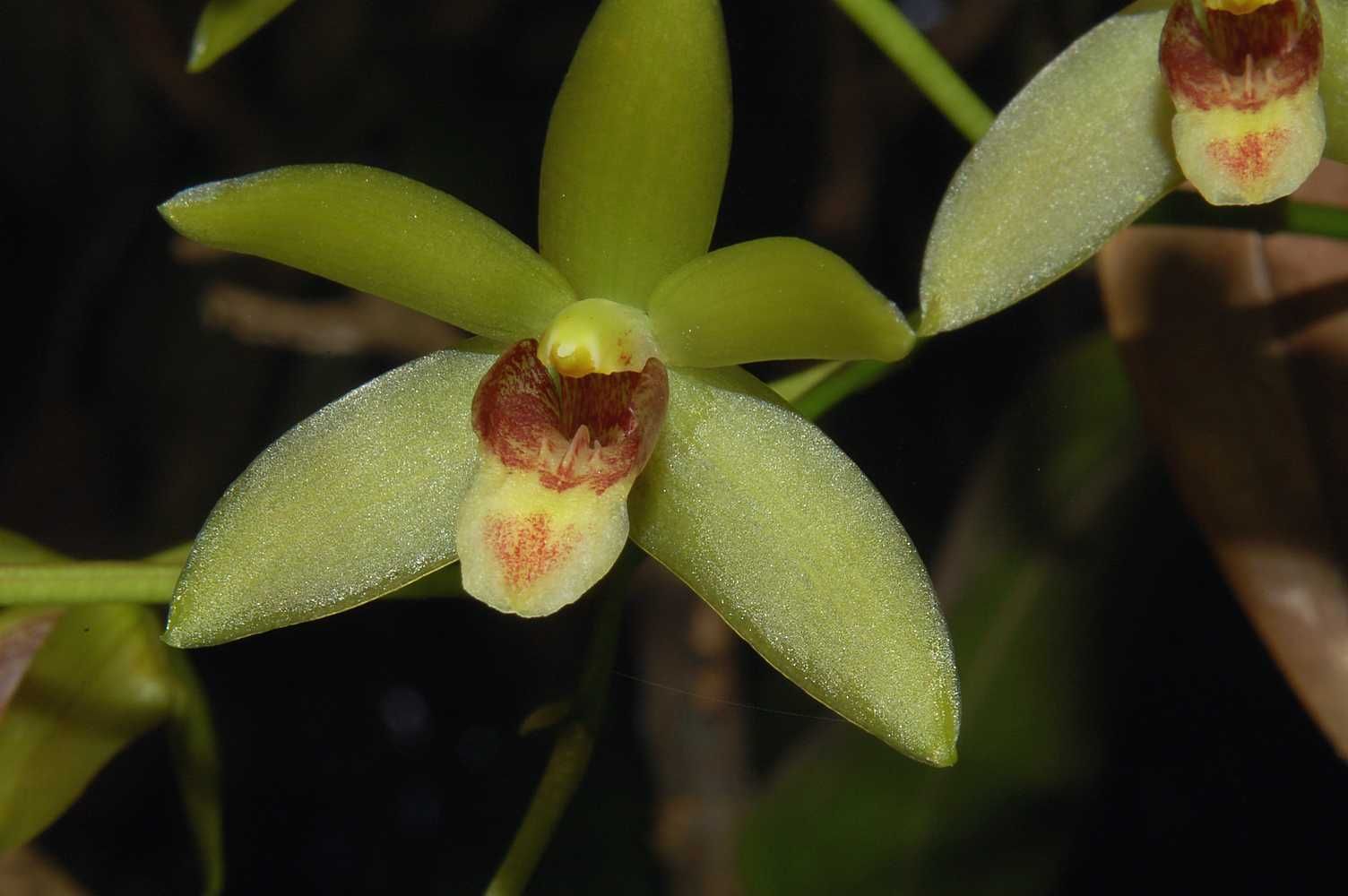 Found in Malaysia, Java and Sumatra on exposed ridges, small trees or on rocks and or mossy ground at elevations around 1600 meters as a small sized, warm growing epiphyte with 2" [5 cm] between each ovoid pseudobulb enveloped in youth by imbricate, scarious sheaths and carrying a single to 2, apical, elliptic, obtuse, coriaceous, petiolate base leaves that blooms on a terminal, much longer than the leaves, 8" [20 cm] long, 4 to 10 flowered inflorescence with ovate, acute floral bracts