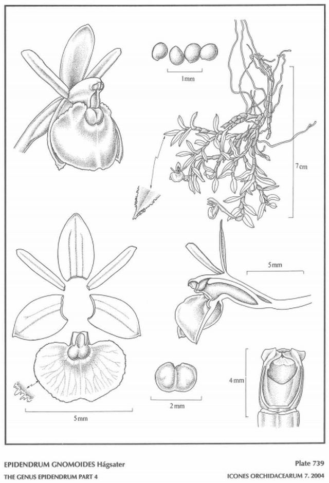 "Epidendrum gnomoides belongs to the GROUP Porpax SUBGROUP Porpax, characterized by the usually small, creeping plants, fleshy succulent leaves, wide-oblique spathaceous bract and solitary or few-flowered, with a fleshy, often shiny, showy lip. The new species is very small, the leaves up to .64" [14 mm] long, the ochre flowers .48" [12 mm] tall, with ovate-elliptic sepals, and a wide, reniform lip, and an elongate inflated vesicle. Epidendrum gnomus has somewhat larger flowers, about .68" [17 mm] tall, an ovate lip, longer than wide, a short, nectary forming a globose vesicle near the apex of the ovary, and ovate-triangular sepals. Epidendrum mathewsii Rchb. f. which also grows in the region has larger plants, flowers about .8" [20 mm] tall, with the lip reniform, convex, 3-keeled with entire margins, and a relatively thin, elongate vesicle." Hagsater etal 2004