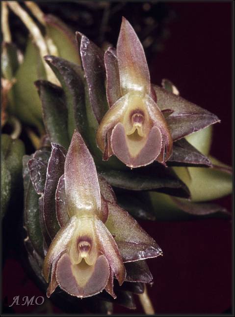 Found in Nayarit, Jalisco, Guerrero and Oaxaca states of Mexico on the Pacific slopes on oaks in open oak forests at elevations of 700 to 1100 meters as a mini-miniature sized, warm to cool growing epiphyte with an erect stem enveloped completely by imbricating leaf bases carrying succulent, ovate, bilobed, aristate, minutely erose-fimbriate margins, dorsally carinate green becoming suffused with purple when grown brighter leaves that blooms in the fall on a terminal, sessile, 2 flowered inflorescence with simultaneously opening, resupinate flowers