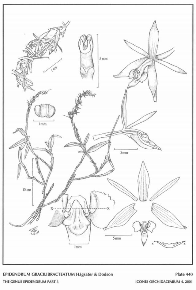 "Epidendrum gracilibracteatum belongs to the GROUP Alpicolum SUBGROUP Pergracile characterized by the sympodial, caspitose to sometimes somewhat creeping habit, stems cane-like, simple, several leaved, with an elongate, apical, racemose, lax-flowered inflorescence, the flowers are star-shaped, membranaceous, the lip 3-lobed, not fleshy thickened, bicallose, the mid-lobe rectangular to triangular, the lateral lobes dolabriform to semi-orbicular. The species is distinguished by the repent habit, simultaneous flowers with large, prominent floral bracts, lateral lobes of the lip semiovate, forming a subrectangular angle in front, the outer margin erose, the front margin entire, apical lobe triangular, acute, and the apical margins thickened. Epidendrum pergracile has longer leaves, larger flowers, a more elongate inflorescence, and the floral bracts only up to slightly longer than the ovary. Epidendrum rhodoides Hágsater & Dodson has a lax-flowered inflorescence, the midlobe of the lip subquadrate; the petals are 5-veined, about as wide as the dorsal sepal and about .4" [10 mm] long, floral bracts shorter than the ovary. Epidendrum vidal-senegei Hágsater & Dodson has larger flowers, the sepals .52 to .64" [13 to 6 mm] long, and the petals linear, half as wide as the sepals, and floral bracts about as long as the ovary." Hagsater etal 2001