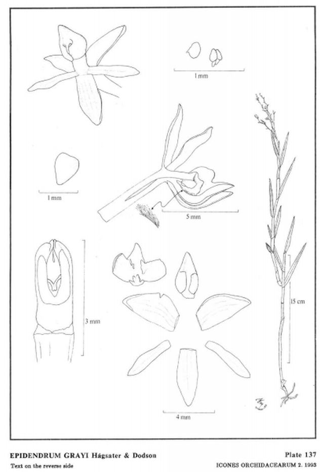 "Epidendrum grayii is part of the GROUP Elleanthoides SUBGROUP Pilcuense characterized by the thin, monopodial stems, branching above when mature, sheaths rugose, inflorescence apical, erect, paniculate, lax-flowered, lacking any spathe, small flowers, and sub-entire to deeply 3-lobed, fleshy lip embracing the apex of the column, 1-callose, the disc of the lip and floor of the nectary opposite the stigmatic cavity pilose. The species is recognized by the slender, branching stems, very narrow leaves with the margins revolute, paniculate inflorescence, and successive, small flowers with 3-lobed lip and nectary profusely pilose in the surface opposite to the stigmatic cavity. The flowers are somewhat similar to those of E. pilcuense Hágsater & Dodson, which is distinguished by the much larger plants, unbranched stems, oblique leaves at least twice larger in linear measurements and sparsely dentate along the margina, and the papillose-pilose lateral lobes of the lip." Hagsater etal 1993