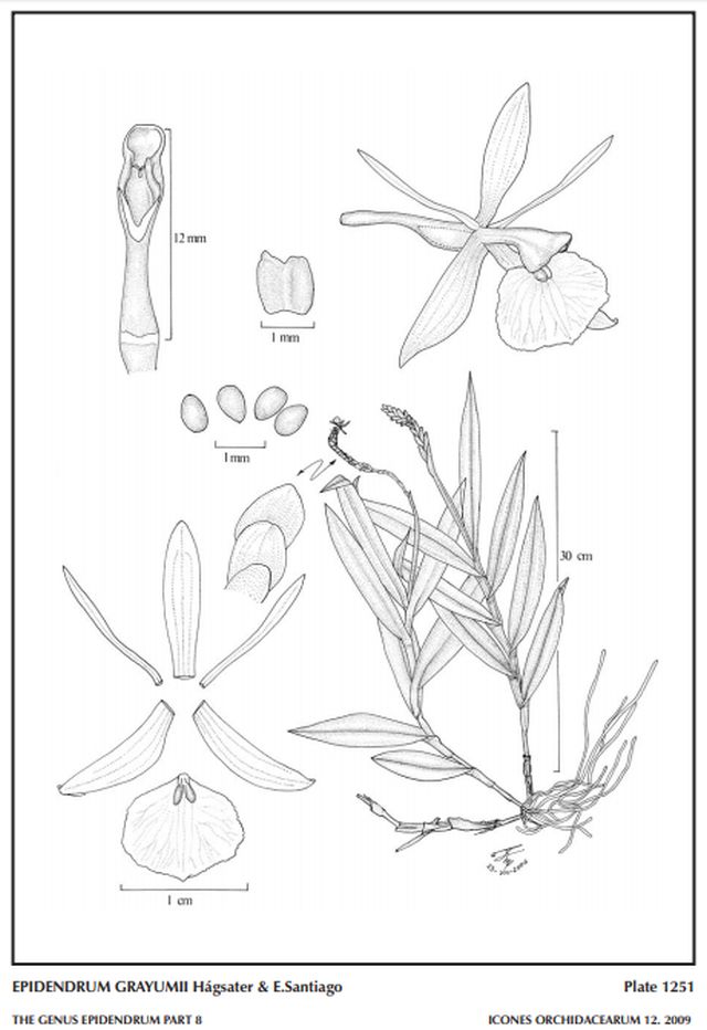 "Epidendrum grayumii belongs to the GROUP Alberti which is characterized by the sympodial habit, laterally compressed to ancipitose or somewhat fusiform-thickened stems, the apical or apical and lateral racemose, distichous inflorescence more or less with imbricating bracts on the peduncle, producing one flower at a time, and the SUBGROUP Allenii which is characterized by the stems with numerous leaves, the apical inflorescence (rarely lateral), peduncle elongate, bare, non-bract bearing, two-winged, the rachis short, covered by rounded, usually imbricating, bracts. The species is recognized by the 20" [50 cm] tall plants with narrowly elliptic, acuminate leaves, greenish white flowers somewhat tinged purple, sepals .44 to .48" [11 to 12 mm] long, the elliptic lip cuneate at the base, the margin crenate, with a pair of small calli and without keels. Epidendrum lankesteri Ames has somewhat larger flowers, sepals .52 to .56" [13 to 16 mm] long, a sub-cordate lip with 3 evident keels, the margin entire. Epidendrum maduroi Hágsater & García Cruz has apical and lateral inflorescences, bronze to greenish colored flowers, peduncle covered by 1 to 3 bracts, sepals .44 to .6" [11 to 15 mm] long, a sub-reniform lip with 3 low keels." Hagsater etal 2009