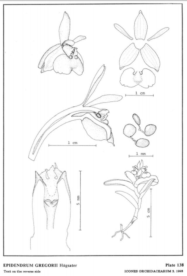 "Epidendrum gregorii Hágsater is a member of the GROUP Difforme characterized by the caespitose, sympodial plants, fleshy, pale green to glaucous leaves, apical inflorescence, sessile, rarely with a short peduncle, one-flowered to many-flowered, and then corymbose, without spathaceous bracts, fleshy, green to yellowish-green rarely white flowers. The species can be recognized by the small flowers, acute sepals with prominent dorsal keel, bilobed lip, each lobe obliquely notched on the distal margin, and c1inandrium somewhat prominent, tripartite. Epidendrum schistostemum is closely related but its relatively short plants, terete stems, 1 to 2 white flowers, entire, widely cordiform lip, the column with prominent apical lateral, obtuse lobes, the margin erose, and separated from the lip by deep sinii, the clinandrium-hood entire, margin dentate. It is similar vegetatively to Epidendrum hammelii Hágsater &: Sánchez but has very different flowers." Hagsater etal 1993