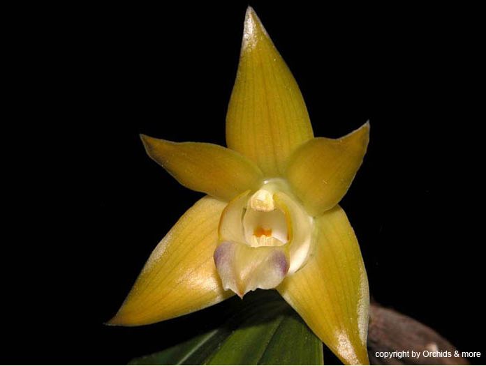 Found in the eastern Himalayas, Assam, Nepal, Myanmar and China on trees and shaded rocks at elevations of 1300 to 2400 meters as a small sized, cool to cold growing epiphyte or lithophyte with 1.6 to 4" [4 to 10 cm] between each ovoid pseudobulb carrying 2, apical, oblong-ellliptic, notched apically leaves that blooms in the spring on a single flowered inflorescence with nearly as long as the ovary, lanceolate, subacute, membraneous floral bract