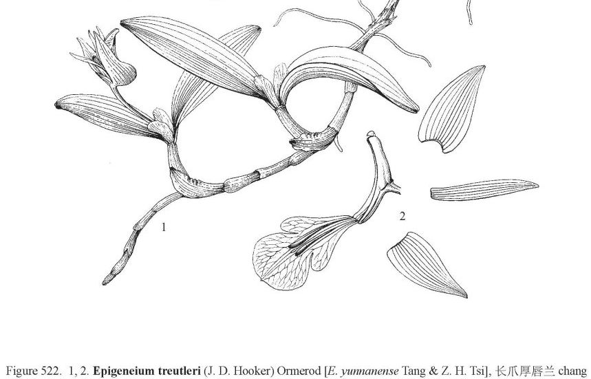 References W3 Tropicos, Kew Monocot list , IPNI ; Icones 22 Hooker 1892 as Coelogyne treutleri drawing fide; Indian Orchids, Guide to Identification and Culture vol 2 Pradhan 1979 as Coelogyne treutleri drawing fide; The Orchids of Bhutan Pearce & Cribb 2002; Flora of China Vol 25 Orchidaceae Zhengyi, Raven and Deyuan 2009; Flora of China Vol 25 Orchidaceae Illustrations Zhengyi, Raven and Deyuan 2010 drawing fide; Atlas of Native Orchids of China Vol 1 Jin Xiaohua, Li Jianwu and Ye Deping 2019 as Epigenuium truetleri photo fide;