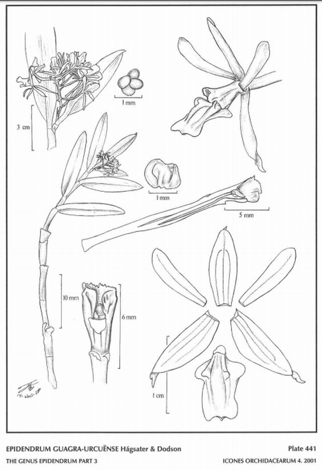 "Epidendrum guagra-urcuense belongs to the GROUP Andean SUBGROUP Cernuum, characterized by the monopodial habit, cane-like stems with subapical branches which are considerably shorter than the main stem, coriaceous to sub-coriaceous leaves, and fleshy flowers, the lip entire or 3-lobed. The species is recognized by the branching stems, the bilobed leaves, 3-lobed pandurate lip, the small triangular-rounded lateral lobes, the midlobe obcuneate-rectangular, the apex 3-lobed, the clinandrium prominent, funnel-shaped and erose-fimbriate, the inflorescence is short and few-flowered. Epidendrum cernuum Kunth also has aristate sepals, but many more, delicate, small flowers with sepals .24 to .52" [6 to 13 mm], giving the inflorescence a fox-tail appearance, the lip is 3-lobed but not pandurate, with the midlobe cuneate and apiculate. Epidendrum brevicernuum Hágsater & Dodson has petals 3-veined and clinandrium short, entire, and the lobes of the lip subequal. Epidendrum pseudocernuum Carnevali & 1. Ramírez has small, falcate lateral lobes of the lip. Hagsater etal 2001