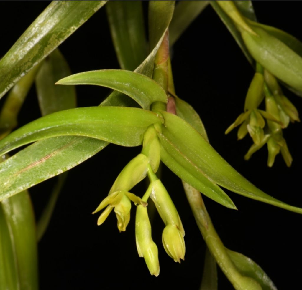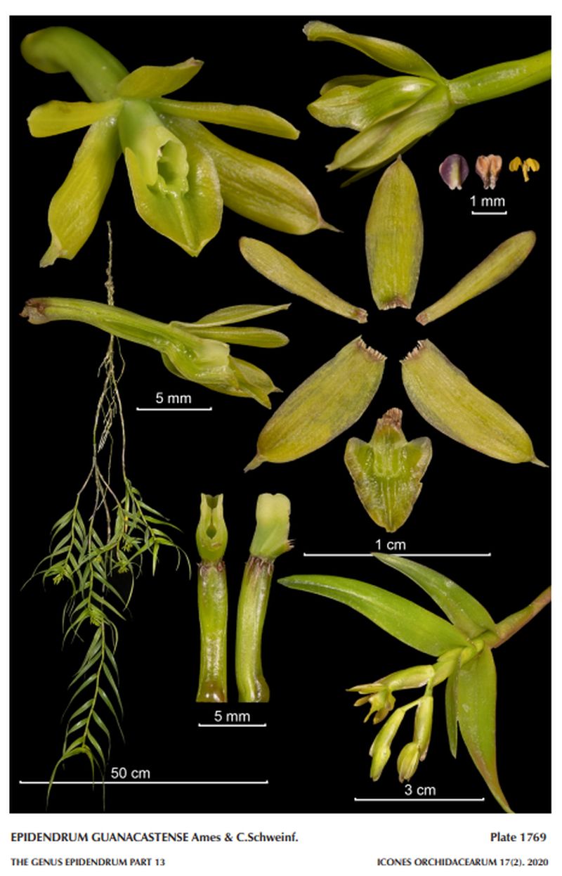 " Epidendrum guanacastense belongs to the GROUP Ramosum which is characterized by the monopodial, branching stems, the spike-like, distichous inflorescence, and the single “Y” shaped callus, and the SUBGROUP Isomerum which is recognized by the pendent plants, very narrow, acuminate leaves, and 1 to rarely 5 flowers. The species is recognized by the leaves of the primary stem 5 to 6" x .32 to .44" [12.5 to 15.0 x 0.8 to 1.1 cm], a 2 to 5 flowered distichous inflorescence, and sepals .32 to .4" [8.0 to 10.0 mm] long. It is similar to the much more widespread E. isomerum Schltr. which also has linear leaves, but a single flowered inflorescence with linear-Ianceolate, acuminate floral segments, and the lip linear-triangular." Hagsater etal 2020