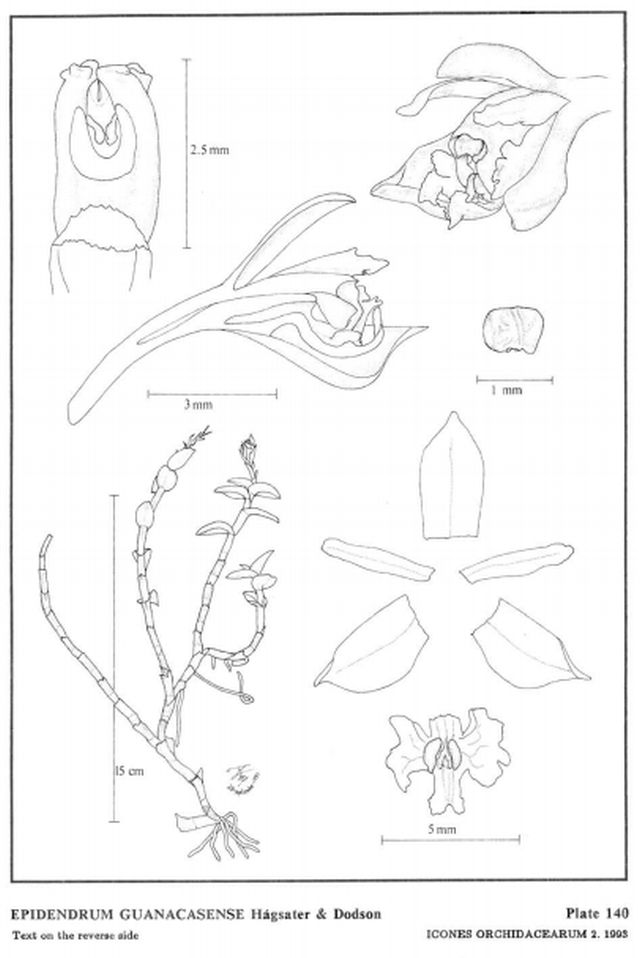 "Epidendrum guanacasense belongs to the GROUP Brevivenium characterized by the repent rhizomes with erect, thin, few-leaved stems, and a pair of conduplicate tubular spathaceous bracts at the apex; the inflorescence is erect, with prominent floral bracts; the lip appears 7-lobed. The species can be easily recognized at first glance by its somewhat creeping hsbit with the thick, erect stems covered by small, ovate, coriaceous leaves, and the erect, racemose, compact inflorescence without a spathe, with 2 to 5 bracts surrounding the basal portion of the peduncle. Its closest relative is E. brevivenium Lindl., which has similar habit but larger plants with fewer, thinner leaves, and has two clearly distinct spathe-like bracts at the base of the inflorescence. Epidendrum guanacasense is comparatively a much more compact plant. " Hagsater etal 1993
