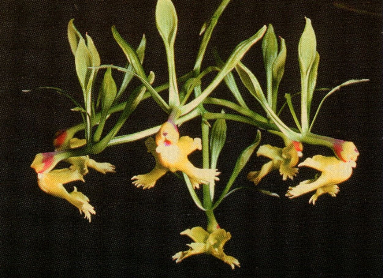 Found in Choco' department of Colombia in montane forests at elevations around 400 to 500 meters as a large sized, hot growing epiphyte with erect, simple, cane-like, laterally compressed, thin, straight, ancipitose stems carrying 8, throughout the apical half of the stem, alternate, articulate, coriaceous, narrowly obovate-elliptic, acute, the underside tinged wine-red, margin entire, spreading leaves that blooms in the late winter and early spring on a terminal, racemose (producing successive, lax, few-flowered racemes from the same peduncle and thus pluri-racemose), straight, laterally compressed, thin, slightly flexuous, 5.2 to 6.4" [13 to 16 cm] long including the 4" [10 cm] long peduncle provided with 3 to 4, scarious, tubular, acute, partly imbricating bracts, rachis laterally compressed, thin, slightly flexuous, simultaneously 4 to 10 flowered inflorescence with shorter than the ovary, triangular, acuminate, amplexicaul floral bracts.