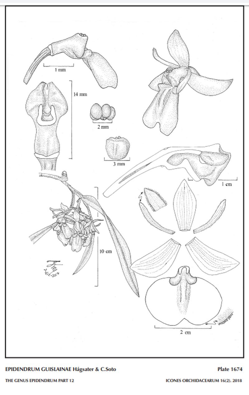 "Epidendrum guislainae belongs to the GROUP Arbusculum SUBGROUP Incomptum which is characterized by the erect habit with successive lateral growths produced from the middle of the previous growth, few leaves aggregate towards the apex of the stems, roots generally only from the base of the primordial stem, with short apical inflorescences and fleshy yellowish to green to violet-green to black flowers with short ovaries, the lip entire to 3-lobed. The species is recognized by the sub-coriaceous leaves, the successive large flowers, sepals .78 to .8" [17.7 to 20 mm] long, without any prominent ventral nectary which inflates the ovary, a obreniform lip, with large, fleshy divergent calli, the margin of the petals and lip minutely ciliate. Epidendrum evelynae has smaller flowers, sepals .36 to .44" [9 to 11 mm]long, a reniform, bicallose lip, the calli small and parallel, and the linear, 1-veined petals with the margin denticulate-erose. Epidendrum chimantense Hágsater & Carnevali has the purple-tinged leaf-sheaths, narrow, elliptic-lanceolate leaves, the column arching only at the base and a slender, non-inflated ovary, sepals .36 to .4" [9 to 10 mm] long, lip reniform, .14 to .24 x .26 to .36" [3.5 to 6.0 x 6.5 to 9.0 mm]. Epidendrum lechleri Rchb. f., a species native to Peru, has .52" [13 mm] long sepals and a 3-lobed lip. Epidendrum nephroglossum Schltr. has very prominent floral bracts equal or longer than the ovary which is not swollen, .44 to .66" [11.0 to 16.5 mm] long sepals, acute petals, lip .28 x .56" [7 x 14 mm], and an obsolete clinandrium. Epidendrum bakrense Hágsater & Cremers has wider petals and shorter segments, sepals .28 to .3" [7.0 to 7.5 mm] long, with a much-inflated ovary, and the column apex with a rounded lobe above the calli, not a tooth. Epidendrum rousseffianae Collantes & Hágsater has somewhat similar reniform lip, but the plant is quite different, with monopodial, branching stems, sepals are .76 to .8" [19 to 20 mm] long and lip 1.16 x.6" [2.9 x 1.5 cm]. *NOTE: We previously illustrated the Icon of Epidendrum evelynae (Santiago & Hágsater, 2015), with a photograph of this new species taken by Gloria Calatayud from Cusco. Now with an inflorescence in spirit, we have been able to prepare an illustration of the material from Machu Picchu, and it is clearly distinct from that of Bolivia, especially by the flowers twice as large, and large fleshy divergent calli, and the minutely ciliate margin of the petals and lip. Vásquez and Ibisch (2004) treated this E. evelynae as a synonym of Epidendrum lechleri Rchb. f.." Hagsater etal 2018