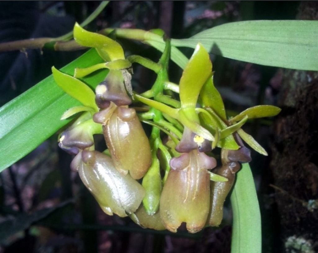 Found in southern Peru, on the Amazon slope of the Cordillera Oriental of the Andes, in montane forest at elevations of 1800 to 2040 meters as a large sized, cool growing epiphyte with simple, cane-like, terete, straight, the new produced from the middle of a sub-apical internode of the previous stem and carrying 3 to 4, sub-coriaceous, smooth, striate leaf-sheath; blade articulate, narrowly oblong, acute, margin entire leaves that blooms in the spring on a terminal, without a spathe, peduncle .6 to .8" [15 to 20 mm] long, laterally compressed, ancipitose, rachis unornamented, 2.4" [6 cm] long overall, apical, from the mature stem, flowering only once, nodding, racemose, successively 2 to 7 open at one time, 3 to 10 flowered inflorscence with triangular, acuminate, shorter than the ovary floral bracts and carrying resupinate, green flowers with the column, calli and mid-rib of the lip tinged purple, especially the apex of the column which may be a solid purple; fragrance not registered.