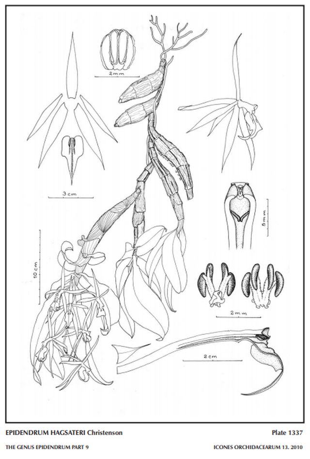 "Epidendrum hagsateri belongs to the GROUP Coilostylis which is characterized by the sympodial, caespitose, pendent plants, coriaceous to succulent leaves, apical, racemose inflorescence with a short peduncle, covered by 1 to 2, non spathaceous bracts, and the large, star-shaped flowers. The species is recognized by the inflorescence produced from the nearly mature pseudobulb, with 3 to 8 flowers, sepals and petals green to copper-brown, lip green to yellowish green, the disc occasionally tinged with red, callus red, column green, turning creamcolored towards the apex; lateral lobes of the lip sub-orbicular to sub-rectangular, mid-lobe triangular. It is similar to Epidendrum lacertinum Lindl. which also has green flowers and the lip occasionally red at the base, the mid-lobe purple, calli white, lateral lobes triangular, and the mid-lobe linear. Epidendrum falcatum Lindl. is lithophytic, with brittle plants, the stems forming fusiform, uni-foliate, pseudobulbs, the leaf coriaceous-succulent, flowers white, sepals pink without, calli yellow, mid-lobe of the lip clearly separated from the lateral lobes by deep sinuses Epidendrum parkinsonianum Hooker 1840 has long, pendent plants, to 80" [2 meters] tall, epiphytic, the stems terete, without forming pseudobulbs, flowers larger, sepals and petals generally 1.6 to 3.4" [40 to 85 mm] long, green to yellowish green, column and lip white, calli yellow, mid-lobe of the lip separated from the lateral lobes by deep sinuses, and generally much longer than the former, by .8 to 1.2" [2 to 3 cm] in length, nectary pilose." Hagsater etal 2010