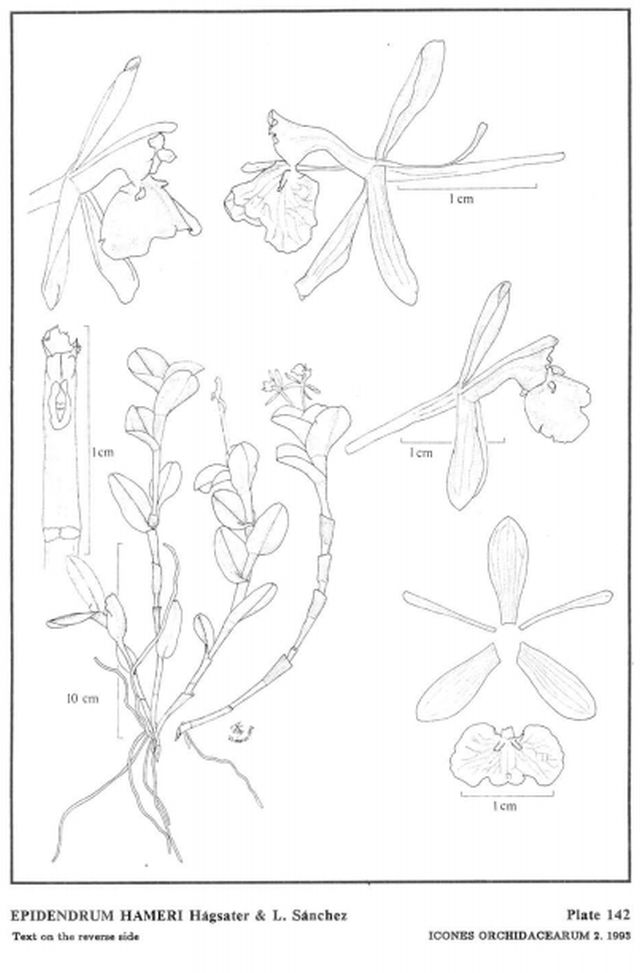 "Epidendrum hameri is a member of the GROUP Difforme characterized by the caespitose, sympodial plants, fleshy, pale green to glaucous leaves, apical inflorescence, sessile, rarely with a short peduncle, one-flowered to many-flowered, and then corymbose, without spathaceous bracts, fleshy, green to yellowish-green rarely white flowers. The species is similar to E. firmum Rchb. f., but can be recognized by the imbricating upper leaves, 1 to 2 small flowers, and 3-lobed lip with dolabriform, crenate lateral lobes and short, emarginate midlobe forming two rounded lobules. Epidendrum lagenocolumna Hágsater, another similar species, has non imbricating upper leaves, 4 to 6, large flowers, semiorbicular lateral lobes, subquadrangular midlobe, and column swollen at the base because of the nectary unusually broad but constricted and decurved aboye the middle." Hagsater etal 1993