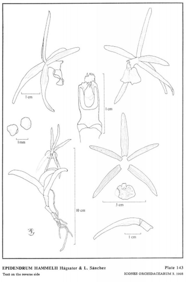 "Epidendrum hammelii is a member of GROUP Difforme which is characterized by the caespitose, sympodial plants, fleshy, pale green to glaucous leaves, apical inflorescence, sessile, rarely with a short peduncle, one-flowered to corymbose, without spathaceous bracts, fleshy, green to yellowish green, rarely white flowers. It can be recognized by the terete stems, two f1owers, lanceolate sepals, linear-elliptic petals, entire, reniform lip with retuse apex, straight column and prominent, entire clinandrium with the margin dentate-fimbriate. Vegetatively it is similar to E. gregorii Hágsater , but floral features separate them at a glance. Epidendrum schistostemum has relatively short plants, terete stems, 1 to 2 white flowers, entire, widely cordiform lip, the column with prominent, apical, lateral, obtuse lobes, the margin erose, and separated from the lip by deep sinii, the clinandrium-hood entire, with the margin dentate. " Hagsater etal 1993 & Plate 1177 2008