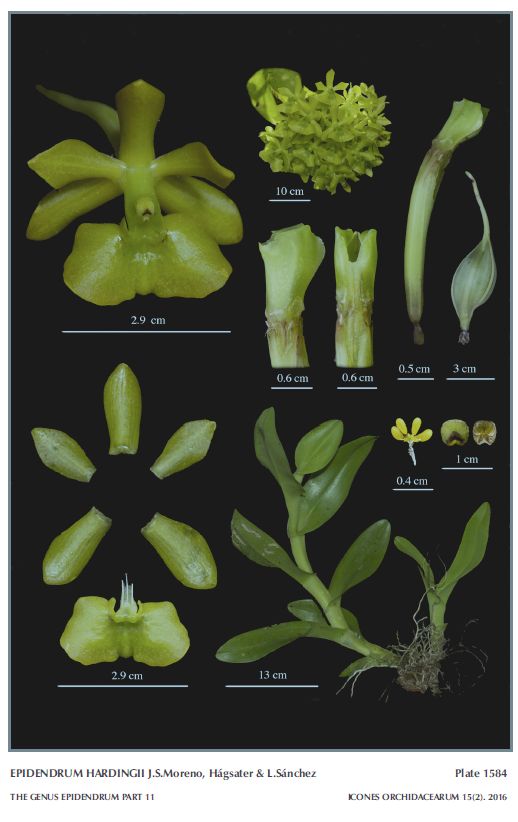 "Epidendrum hardingii belongs to the GROUP Difforme which is characterized by the caespitose, sympodial plants, fleshy light green to glaucous leaves, apical inflorescence without any spathe, sessile, rarely with a short peduncle, one-flowered to corymbose, fleshy, and flowers green to yellowish-green, rarely white. The species is recognized by the ancipitose stems, large leaves 1.6 to 2.72" x .8 to .96" [4 to 6.8" x 2 to 2.4"] wide and rarely 4 to .68" x 2 to 2.4" [10 to 17 x 5 to 6 cm] wide, 30 to 35 flowered inflorescence, sepals .8 to .84" [20 to 21 mm] long, the lip bilobed, with a long, wide, fleshy mid-rib running to the apical sinus, and the single callus, a fleshy, elevated plate, with a shallow sinus at the apex, with a drop of nectar in front on the disc of the lip. It is similar to Epidendrum pseudapaganum from southern Ecuador and Peru, which has narrower leaves 4.8 x 1.8" [12 x 4.5 cm], smaller flowers, sepals .4 to .48" {10 to 12 mm] long, an entire, reniform lip without any evident ribs, bicallose, calli separate and divergent. Epidendrum apaganum Mansf., from the basin of the Río Marañón in Peru, has shorter plants, 6.4 to 10.4" [16 to 26 cm] tall, shorter, narrower leaves 1 to 2.8' x 1 to 1.8" [2.5 to 7.0 x 2.5 to 4.5 cm], a 1 to 5-flowered inflorescence, flowers smaller with sepals .56 to .64" [14 to 16 mm] long, petals linear-oblanceolate, lip 3-lobed, with numerous thickened veins. Epidendrum fusagasugaënse E.Parra, Hágsater & L.Sánchez, endemic to the departments of Cundinamarca, Huila and Santander in Colombia, on the Eastern Cordillera has leaves shorter and wider, 3.2 to 4.8" x 1 to 2.92" [8 to 12 x 2.5 to 7.3 cm], inflorescence 3 to 5 flowered, sepals are similar in size, but the ovary is longer 1.88 to 2.4" [47 to 60 mm] long, lip also has a thickened, fleshy mid-rib, but the disc is thickened and dark green, and bicallose, the calli separate and sub-globose. Epidendrum melistagum Hágsater from Mexico shares a single callus, and the drop of nectar on the disc of the lip, but is otherwise smaller overall." Hagsater etal 2015