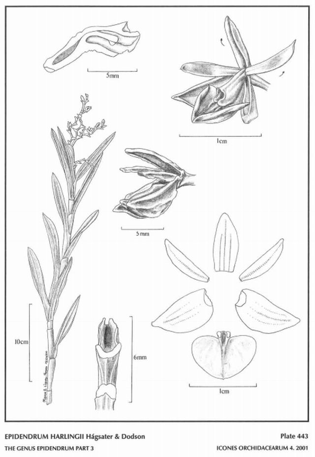 "Epidendrum harlingii belongs to the GROUP Frutex characterized by the caepitose habit, usutally simple stems, lanceolate leaves, inflorescence lacking spathes, nutant racemes, and a widely cordiform to reniform lip. The species is recognized by the caespitose habit, simple stems, short, lanceolate leaves, nutant branches of the inflorescence, widely cordiform lip, obliquely elliptic petals with entire lip and the greenish-brown flowers. Epidendrum papallactense has a larger habit overall, the flowers are brownish violet, and the petals have an erose margin. Epidendrum frutex Rchb.f. is much larger and has smaller flowers with a rhombic lip. Epidendrum aquaticoides C. Schweinf. has stouter stems, larger leaves and orange-red flowers." Hagsater etal 2001