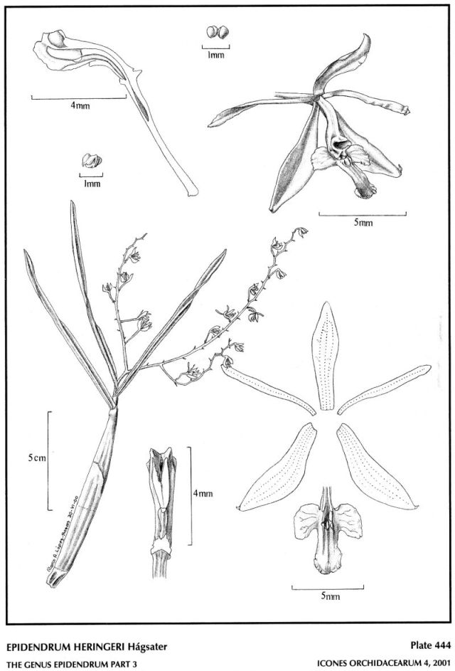 "Epidendrum heringeri is part of the GROUP Amblostomoides characterized by the caespitose habit, the thinly fusiform stems carrying narrow, apically bilobed, subcoriaceous leaves distributed towards the apical half of the stem that blooms on an often large, apical, erect, paniculate infloresence carrying greenish yellow to white flowers with a 3 lobed lip and with the ovaries and sepals usually dorsally pubescent. The species is recognized by its simple, fusiform, cane-like stems, long, linear, narrow leaves, delicate, paniculate inflorescence, the apical portion zigzag, and the small glabrous, white flowers with a 3-lobed lip, the lateral lobes obliquely ovate, and the rectangular midlobe ending in a widened, rounded plate. It is similar to Epidendrum purum which is overall more stout, the rachis thicker and straight, the flowers generally larger, the column straight, clinandrium shorter." Hagsater etal 2001