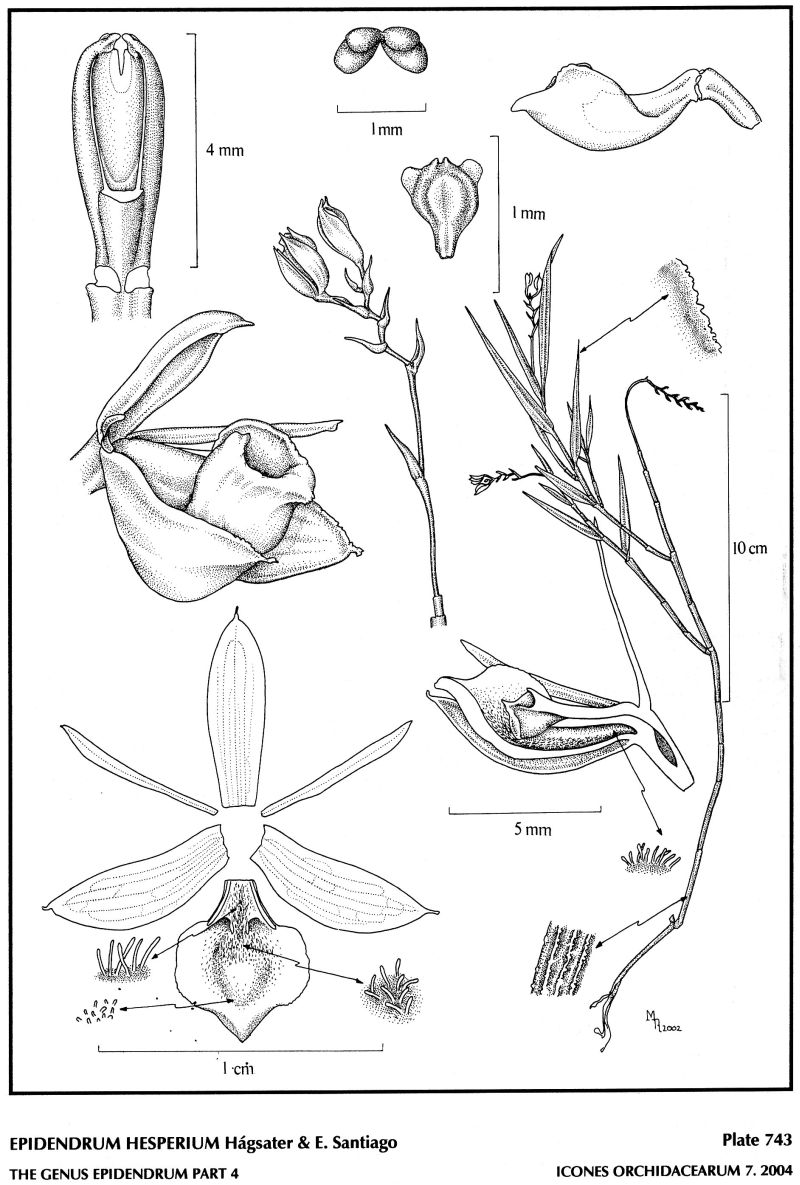 "Epidendrum hesperium belongs to the GROUP Elleanthoides SUBGROUP Guacamayense which is recognized by the branching habit, the grass-like leaves and the distichous inflorescence with a zigzag rachis and filiform pedunde, the flowers fleshy, the lip cup-shaped and often embracing to overlapping over the column. The new species is recognized by the generally racemose inflorescence wlth up to 15 flowers, .28" [7 mm] long sepals, the long-narrow leaves, the entire lip about as long as it is wide and somewhat overlapping over the column. It is similar to Epidendrum triodon Hagsater & Dodson, which has a three dentate lip, the leaves half as long and wider, and the peduncle short and not filiform. The inflorescence is reminescent of Epidendrum bryophilum Hágsater & Dodson, which has the flowers quite distinct, with the column shorter and arching downwards, the nectary wider and the lip not overlapping above the column. Epidendrum elleanthoides Schltr. has smaller flowers, with sepals less than .2" [5 mm] long, the lip IS transversely elliptic, and the column is straight. Epidendrum campylostele Hágsater & R. Vásquez also has an incurved column, but the floral bud is foot-like, with a prominent heel, and the sepals falcate, the stigmatic cavity proportionately occupies most of the ventral surface of the column, the inflorescence is generally paniculate, each raceme with 2 to 4 flowers." Hagsater etal 2004