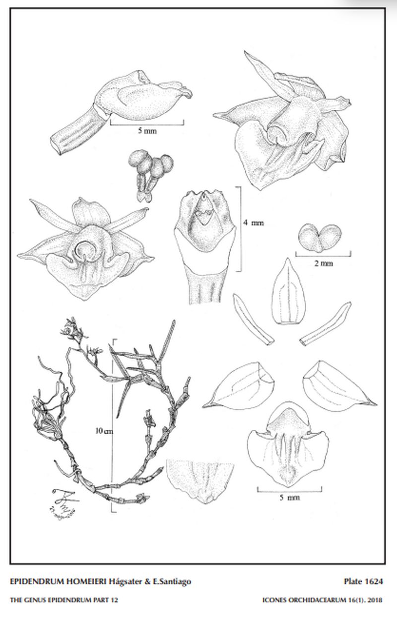 "Epidendrum homeieri does not appear to belong to any of the known groups, and thus we establish a new GROUP Homeieri characterized by the cane-like stems, produced in succession from below the middle of the previous stem, inflorescence laxly few-flowered, distichous, with a laterally compressed, ancipitose, two-winged peduncle, subtended by a large spathe, tubular at base, acute; the flowers have the lip partially united to the column, somewhat less than half the length of the column, lip entire, ecallose, with 3 ribs on the disc. The species is recognized by the .72" [18 mm] long spathe, flowers pale yellowish green to green tinged dirty purple, sepals 2.12 to .248" [5.3 to 6.2 mm] long; lip entire, united the basal half of the column, widely separated above, ecallose, with 3 evident parallel ribs and an orbicular thickening near the apex. Epidendrum subliberhombicum Hágsater & E.Santiago is florally very similar, but the stems are slightly thickened along the apical half, the inflorescence has up to 100 densely distributed flowers, sepals .14" to .208" [3.5 to 5.2 mm] long, the lip is 3-lobed with the base slightly unguiculate, and without any ribs. Epidendrum subliberum C.Schweinf. has thickened stems along the apical half, a dense inflorescence of ca. 120 reddish brown flowers, sepals .128 to .152" [3.2 to 3.8 mm] long; lip 3-lobed, free from the column, without ribs and the margin erose, column thin and straight. The short, laterally compressed, two-winged peduncle below the large spathe is reminiscent of species of Epidendrum aristatum Ackerman & Montalvo, though in that species the peduncle is much longer, and the rachis very short, with the flowers produced singly in succession." Hagsater etal 2018