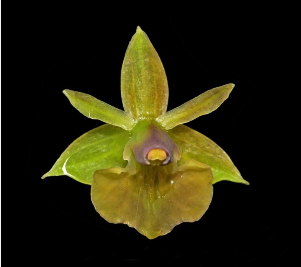 Found in Loja Province of Ecuador in the Parque Nacional Podocarpu at elevations of 2500 to 3060 meters as a small to medium sized, cold growing epiphyte with cane-like, terete, each new stem produced from a lower internode of the previous stem, base covered by a single leafless sheath .38" [9.5 mm] long, tubular, rugose stems carrying 2 to 3, distributed along the apical half of the stem, articulate, coriaceous, straight to somewhat falcate, lustrous above, glaucous on the underside with tubular, infundibuliform when dry, rugose basal sheaths, blade linear-lanceolate, acute, minutely apiculate, margin crenulate leaves that blooms in the later winter and earlier spring on a terminal, apical, simple, distichous, arching, arising through a tubular, conduplicate, acute, at the end of a short and ancipitose, .72" [18 mm] long spathe, peduncle .8 to .18" x .04" [20 to 45 x 1 mm], thin, laterally compressed, rachis terete, thin, slightly sinuous, 1.6 to 2.4" [4 to 6 cm] long overall, laxly simultaneously,5 flowered inflorescence with , nearly as long as the ovary, linear-lanceolate, acuminate, embracing floral bracts and carrying distichous, non fragrant flowers with the lip always facing the rachis, green tinged dirty purple to pale yellow-green, and then the lip ochre-green, the apex of the column pale purple.