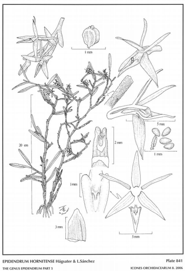 "Epidendrum hornitense is part of GROUP Ramosum characterized by the monopodial, branching stems, the spike-like, distichous inflorescence, and the single callus, and the SUBGROUP Rugosum which has a branching habit with few-flowered inflorescence from short, secondary stems, the leaf-sheaths rugose. The species has terete stems, 3-veined, lanceolate, acuminate sepals, linear, 3-veined petals with the lateral veins shorth a narrowly triangular, acute lip, cordate basaIy and fleshy thickened towards the apex. It is similar to Epidendrum monophlebium Hagsater from central Costa Ri ca which has similarly small flowers, single veined petals, the lip tru cate at the base, apically acuminate and not fleshy thickened. Epidendrum sanchoi Ames has white to greenish white, somewhat larger flowers with sepals .18 to .26" [4.5 to 6.5 mm] long, 5-veined, acute sepals with a prominent dorsal, apical keel, and the triangular-acuminale lip .16 to .2" [4 to 5 mm] long, ecallose, the dlsc with 3 thickened nerves. Epidendrum orthodontum Hágsater & L.Sánchez, has larger flowers, the 5-veined sepals .36 to .48" [9 to 12 mm] long, a 3-lobed lip .28 to .36" [7 to 9 mm] long, and a thlck column with an erect apical tooth and a pair of lateral subquadrate wings." Hagsater etal 2006