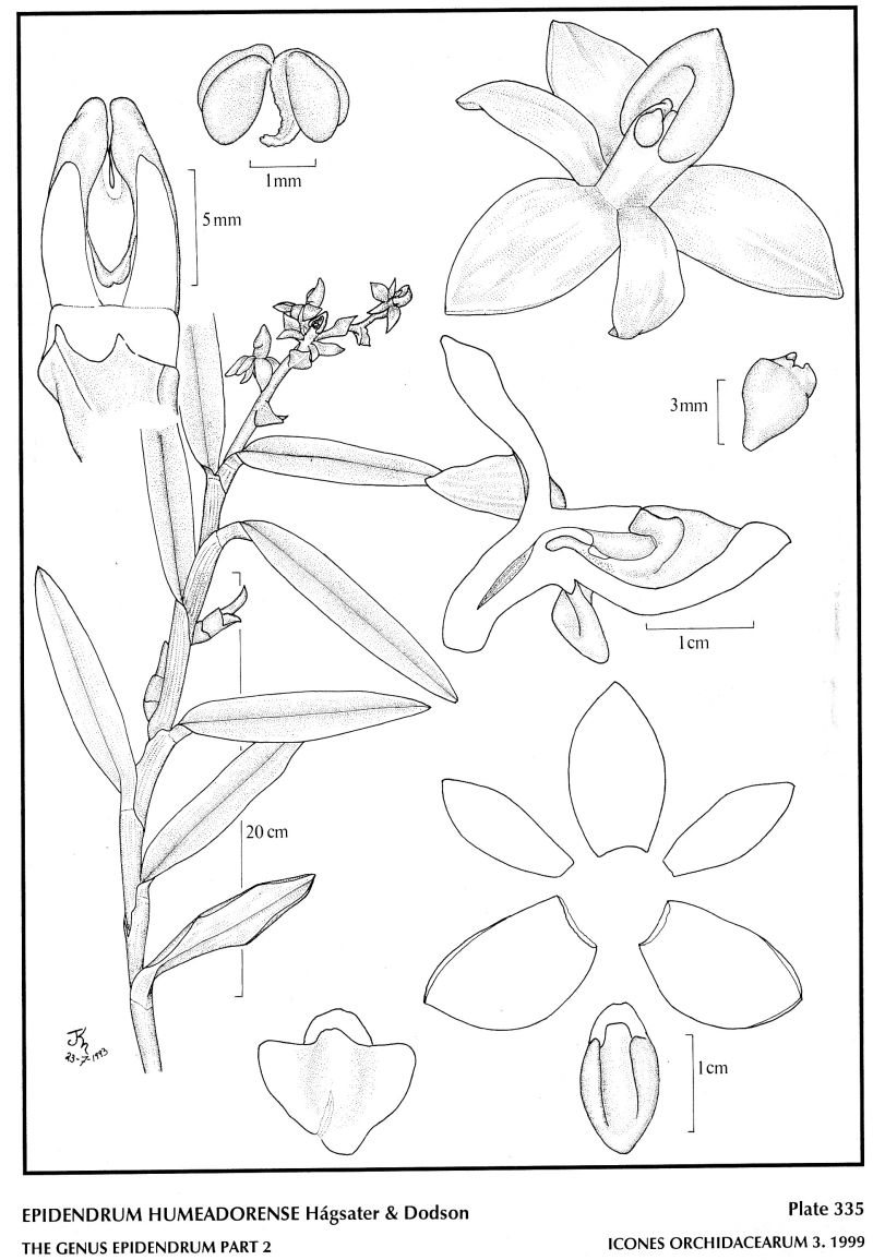 "Epidendrum humeadorense is part of GROUP Macrostachyum characterized by the erect, branching, cane-like stems giving rise to an erect to arching, many flowered inflorescence without a spathe the very fleshy lip that is folded and embracing the column and a pubescent to papillose nectary in front of the stigmatic cavity The species is closely related to E. chondrochilum, but is recognized by its 5 to 7, simultaneous, yellow-green flowers, floral scent of jasmin-geraniol, the segments wide with a low rounded apical keel in front, sepals twice as wide as the petals, the lip triangular. Epidendrum palaciosii Hágsater & Dodson has flowers about one-third the size, the sepals muricate outside, not keeled Epidendrum dermatanthum Kraenzl. has petals nearly as wide as the sepals. Epidendrum coordinatum Rchb. f. has carinate, acute sepals, but the apex of the column has dolabriform wings. E. chondrochilumhas filiform petals and a cordate lip. Epidendrum oxycalyx Hágsater & Dodson has acuminate sepals and petals, and a cordiform-triangular lip." Hagsater etal 1999