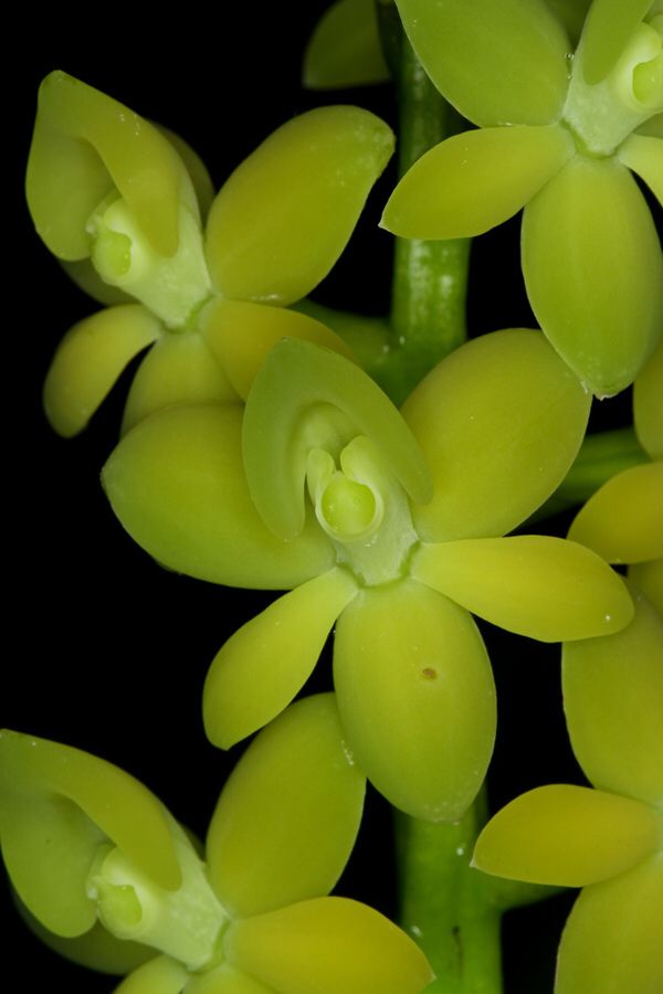 Found in northernmost Ecuador on the western slope of the Andes in montane cloud forests at elevations around 2300 meters as a giant sized, cold growing terrestrial with erect, branching with age, cane-like, terete stems carrying numerous, all along the stem, branches mostly 5 to 6, unequal in size, narrowly elliptic-lanceolate, acute, margin finely erose-denticulate leaves that blooms in the spring on a terminal, erect, racemose, without a spathe, on a mature stem, occuring only once, erect, flexuous, 3.2 to 5.2" [8 to 13 cm] long, simultaneosuly 5 to 7 flowered inflorescence with shorter to equal to the length of the ovary, progressively shorter above, cucullate, ovate, margin undulate, finely erose floral bracts and carrying non resupinate, yellowish green flowers.