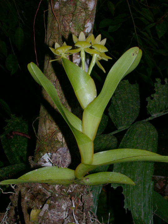 Found in Costa Rica and Panama in lowland, montane rainforest and cloud forests at elevations of 10 to 2200 meters as a small to medium sized, hot to cool growing epiphyte with simple, cane-like, laterally compressed, ancipitose stems carrying 5 to 8, all along the stem, coriaceous, elliptic to ovate, retuse, margin entire leaves that blooms in the late winter through late fall on a terminal, occuring only once, sessile inflorescence arising on a mature stem with shorter than the ovary, triangular, acute floral bracts and 4 to 6, resupinate, simultaneously opening flowers.