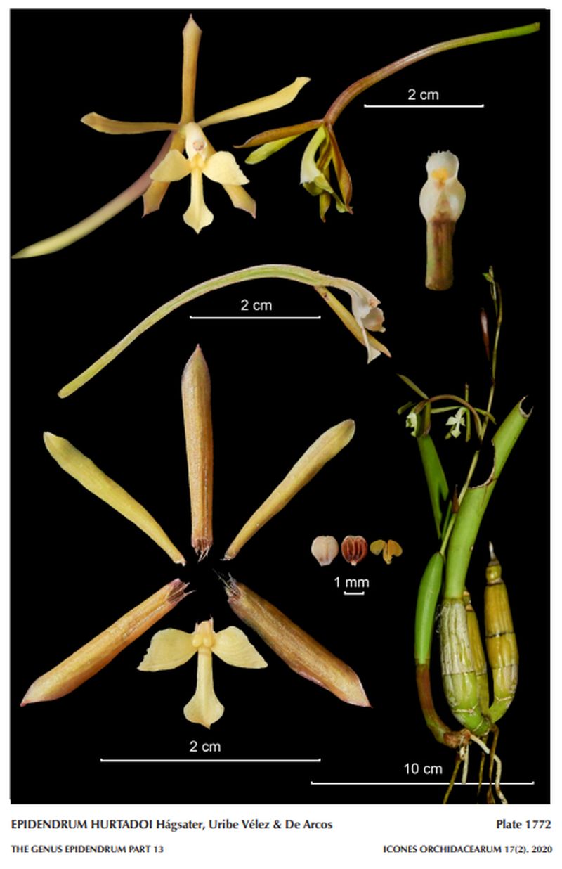 Common Name Hurtado's Epidendrum [Andrés Hurtado García (1941-), born in Armenia, Colombia, Marista Brother, PHD in Literature from the Universidad Complutense de Madrid, journalist, photographer and ecologist by nature, he has lectured worldwide on conservation, founded Colombia Secreta, pioneer in ecotourism, the Ciudad de Piedra, and Puerta de Orión in the Serranía de La Lindosa, where the species was discovered]