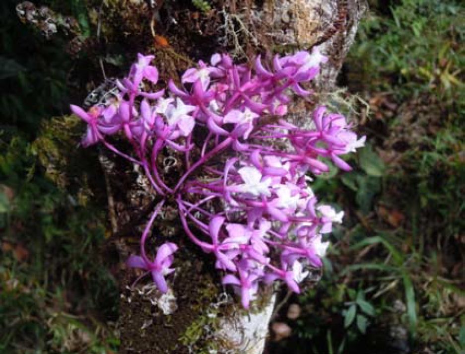Found in Antioquia and Valle de Cauca departments of Colombia on the Cordillera Occidental and on the western slope of the Cordillera Central in Antioquia in premontane tropical forest at elevations of 1500 to 2870 meters as a giant sized, cool to cold growing, caespitose epiphyte with simple, cane-like, terete, thin, straight stems carrying 5 to 10, all along the apical half of the stem, alternate, articulate, oblong-elliptic, short acuminate, subcoriaceous, underside tinged purple, margin entire leaves that blooms in the late winter through mid fall on a terminal, paniculate, erect, peduncle 4.2" [10.5 cm] long, thin, somewhat laterally compressed, straight, enveloped by 3 tubular, sscarious, acuminate, partly imbricating bracts, rachis with 3 to 5 short branches, successively few, 6 to 10" [15 to 25 cm] long overall, densely 40 to 70 flowered inflorescence with much shorter than the ovary, narrowly triangular, acuminate, amplexicaul floral bracts and carrying resupinate, softly fragrant, purple rose flowers with cream colored disc and calli.