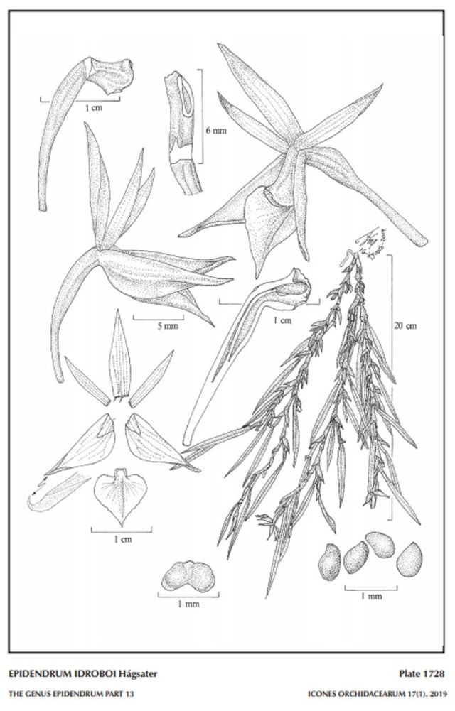 "Epidendrum idroboi belongs to the GROUP Kalopternix SUBGROUP Garayii which is recognized by pendent chain of stems, arising each from a sub-apical internode of the previous stem, each with 1 to 3 linear-lanceolate leaves, inflorescence apical, flowering only once, 1 to 2 flowered, the flowers non-resupinate, green to red to yellow, the lip cordiform, ecallose. The species is recognized by the long sympodial segments in 3 to 5 sections, two covered by non-imbricated sheaths, the last enveloping the fusiform pseudobulb, apically with a single leaf, 1.46 to 2.92" x .2 to .24" [36 to 73 x 5 to 6 mm], 1 to 2 flowered, the flower green outside, lemon colored inside with white column, sepals .48 to .6" [12.0 to 15.0 mm] long, 5-veined, lip, widely cordiform, acuminate. Very similar to Epidendrum garayi Lřjtant (replaced synonym of: Pleuranthium cardiochilum Garay) which has however 2 to 3 leaves per pseudobulb, flowers similar but greenish purple, sepals .4 to .48" [10 to 12 mm] long and lip .44 x .24 to .28" [11 x 6-7 mm], cordiform, apiculate. Epidendrum falsigarayi Hágsater & Karremans has brick red flowers. Epidendrum wolfii Hágsater & E.Santiago has short, bifoliate, cane-like stems, linear-lanceolate leaves .44 to 1.08" [1.1 to 2.7 cm] long, the sessile, 2-flowered inflorescence, successive and opposite, pink, immaculate flowers, the lip widely cordiform with the apex obtuse, the disc with a single evident, low, wide rib running down the middle. Epidendrum carmelense Hágsater & Dodson forms pseudobulbs at the end of the stems which are unifoliate, leaves are 1.4 to 2.4" [3.5 to 8.5 cm] long, with 1 to 2 greenish to ochre flowers with reddish dots, the lip is reniform, without any ribs." Hagsater etal 2019