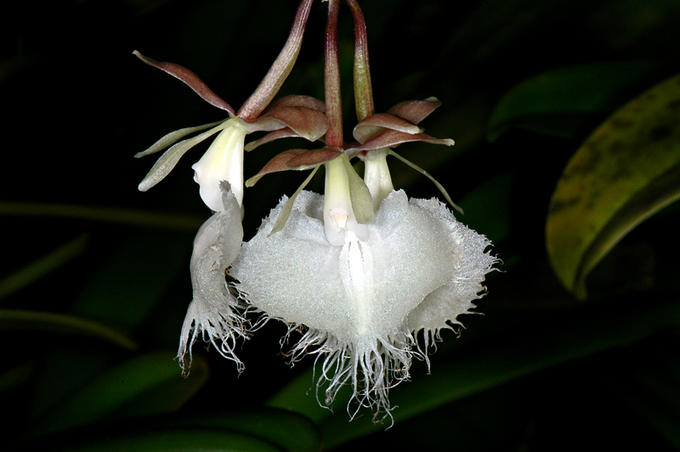 The fact that this species has clusters of white, softly fragrant flowers, with a long fringe on the lip, along the stem arising from previous years inflorescence as well as at the apex distinguishes it from others. Leave old spikes until dead and brown as they can rebloom for several years from a node above the old rachis.
