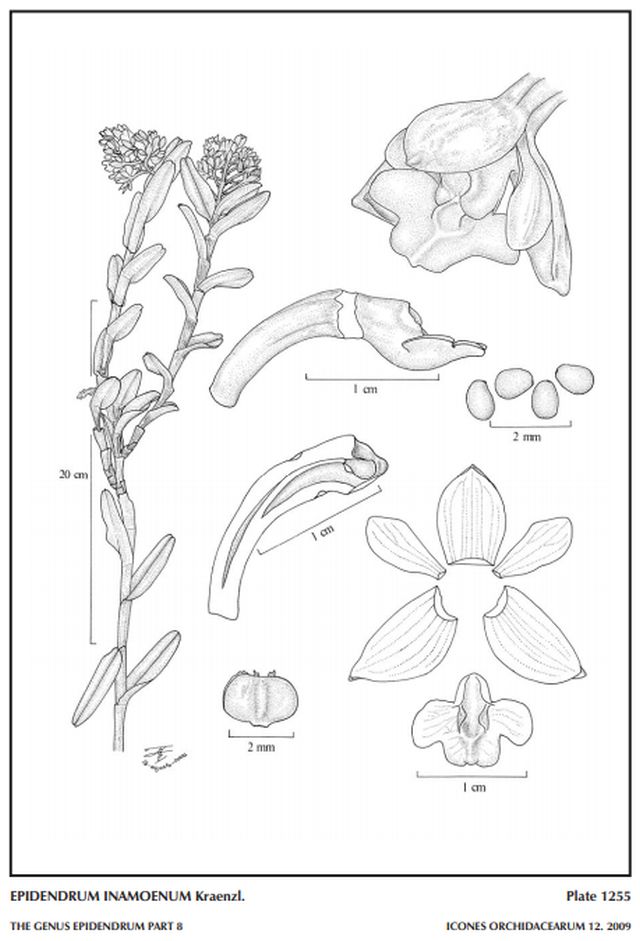 "Epidendrum inamoenum belongs to the GROUP Andean SUBGROUP Soratae which is characterized by the tall plants, monopodial habit, generally large, bilobed leaves, racemose inflorescence, entire or 3-lobed lip with a channel at the base of the disc between the calli. The species is recognized by the sub-erect, oblong leaves, green to yellowish green flowers, sepals .36 to .4" [9 to 10 mm] long, and “Y” shaped fleshy keel on the lip, the lateral lobes of the lip longer than the midlobe. Epidendrum jaramilloi Hágsater & Dodson is vegetatively very similar, but the leaves are narrowly lanceolate, sepals .32 to .52" [8 to 13 mm] long, and the disc of the lip has a rounded fleshy thickening, the lateral lobes of the lip are ovate, nearly as long as the midlobe. Epidendrum chioneum Lindley is endemic to Colombia, has triangular-lanceolate, acute, apiculate leaves , the flowers are snow-white, sepals .24 to .32" [ 6 to 8 mm] long, and the disc of the lip has 3 low keels" Hagsater etal 2009